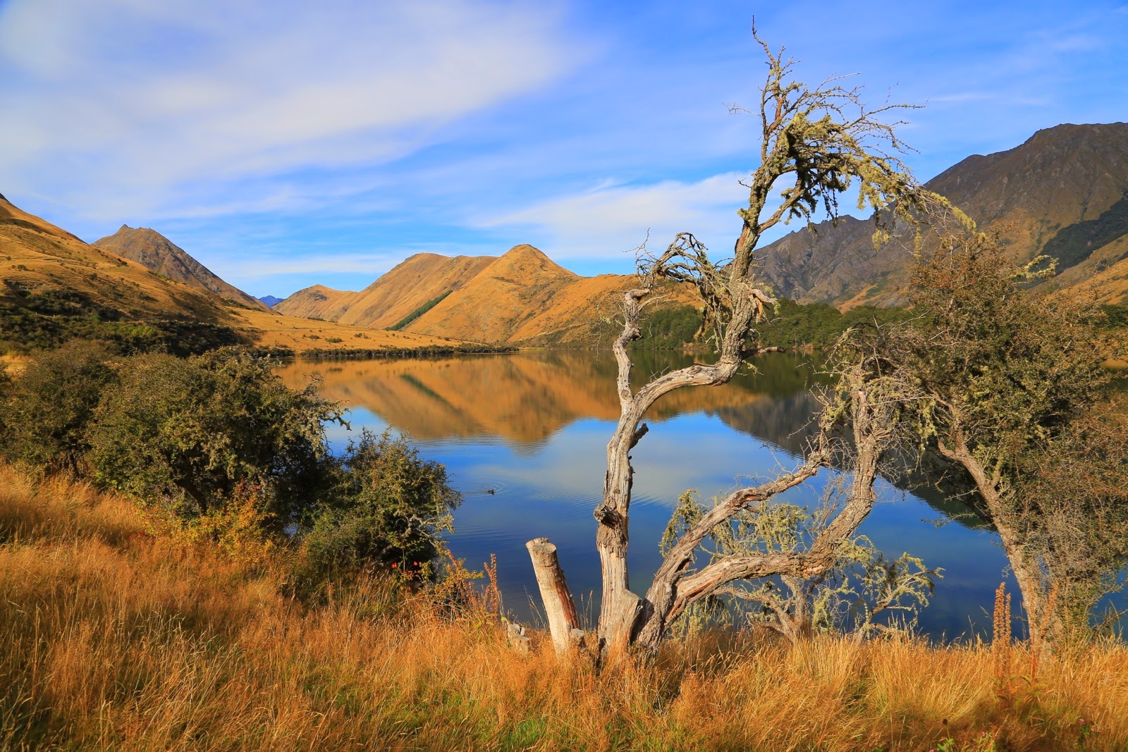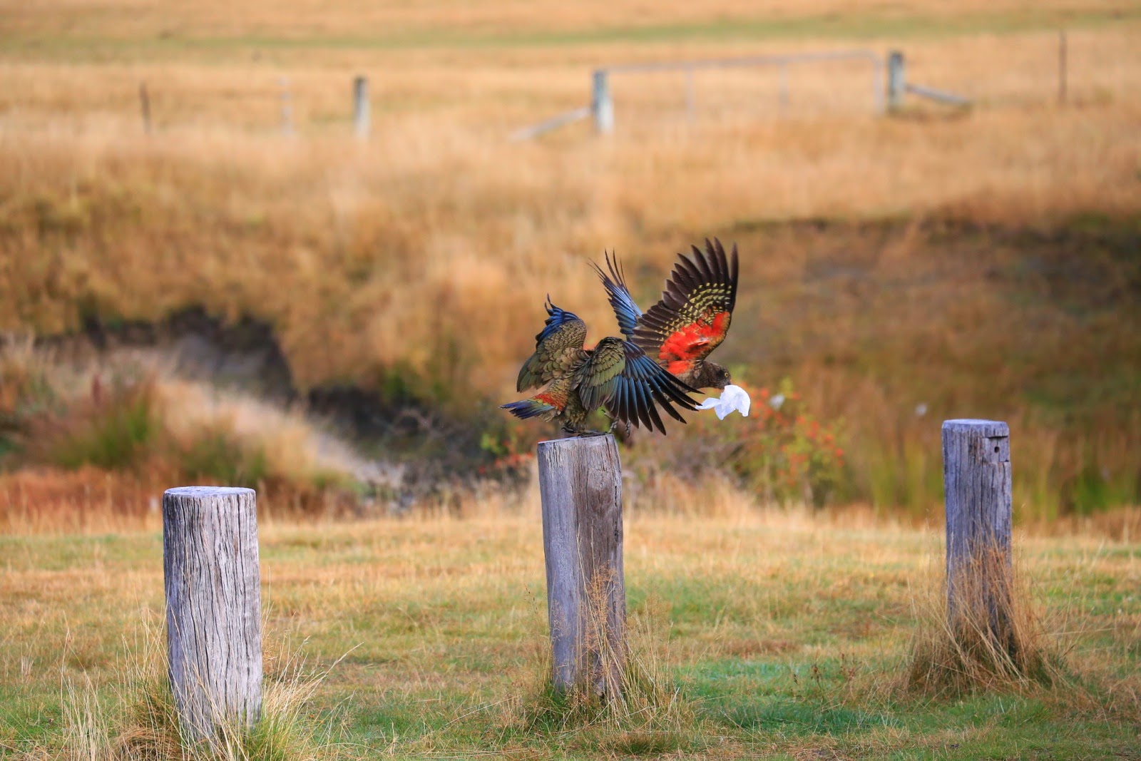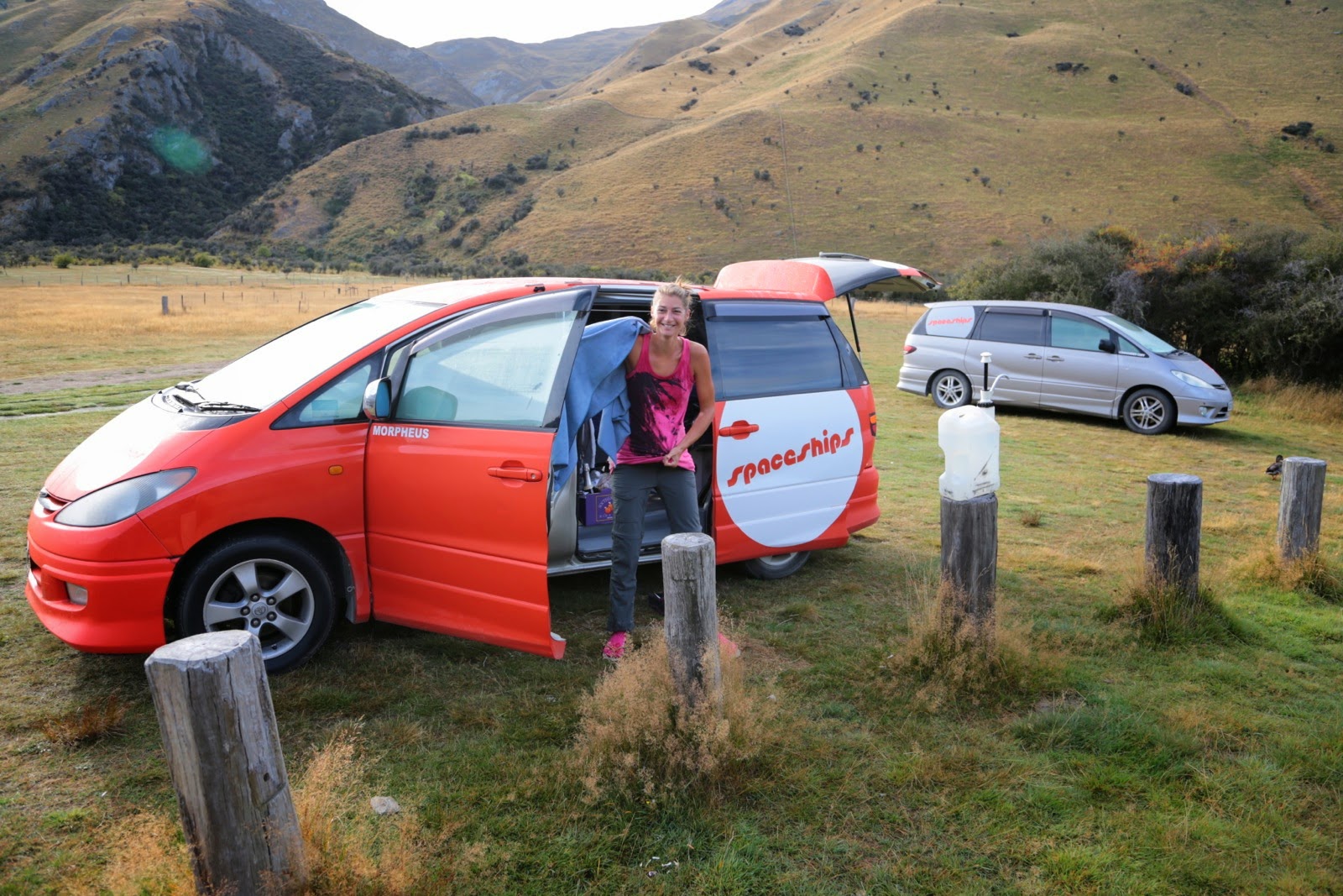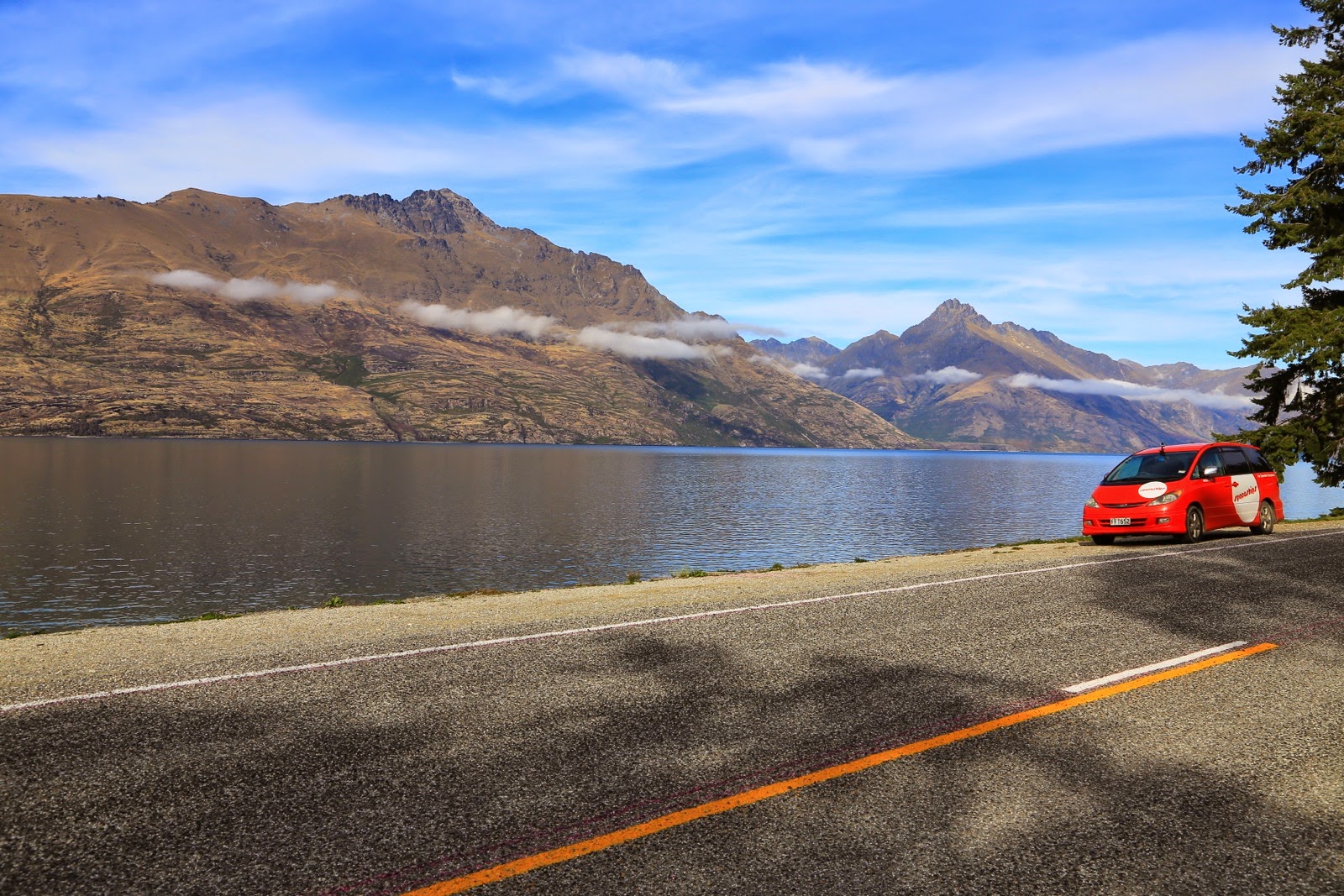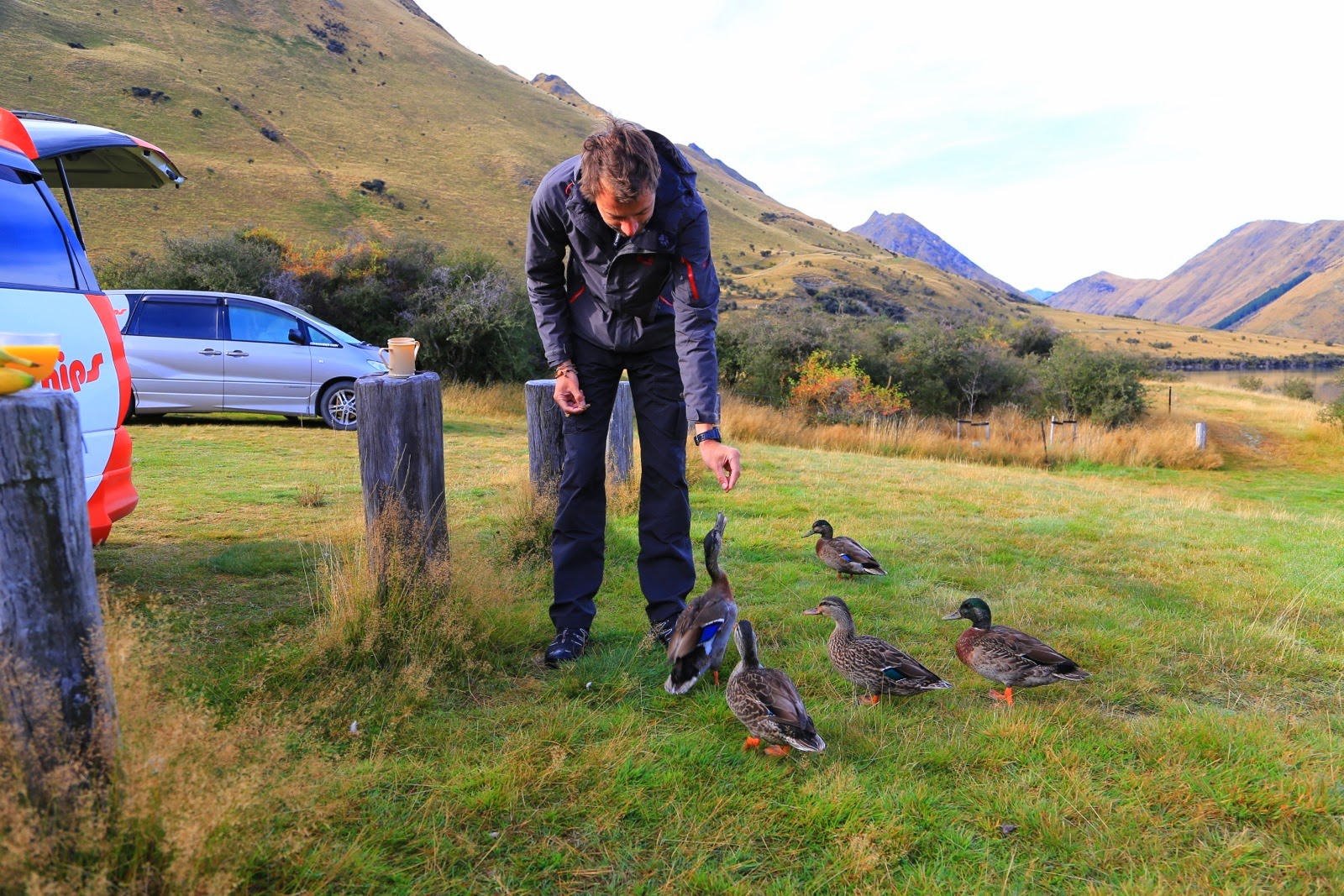 Pour la nuit, on s’éloigne de l’agitation de Queenstown en parcourant une dizaine de km avant d’emprunter une piste qui nous emmène au bord du féérique lac Moke dont la surface reflète les montagnes tel un miroir quasi parfait. On y adopte une famille de canards, fascinés par la toilette d’Adèle au moyen du jerricane. Mais ce sont d’autres volatiles, des Nestor keas, qui nous réveilleront au petit matin en faisant du moonwalk sur le toit du campervan tout en poussant leur puissant cri qui leur a valu leur nom !