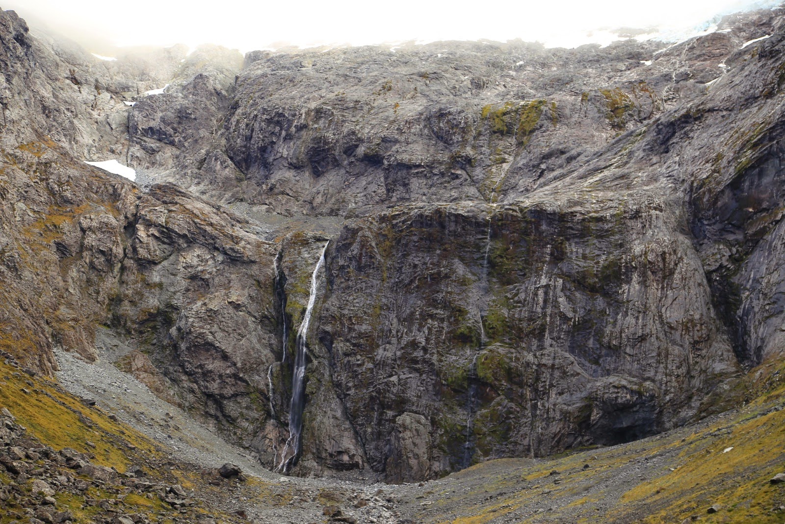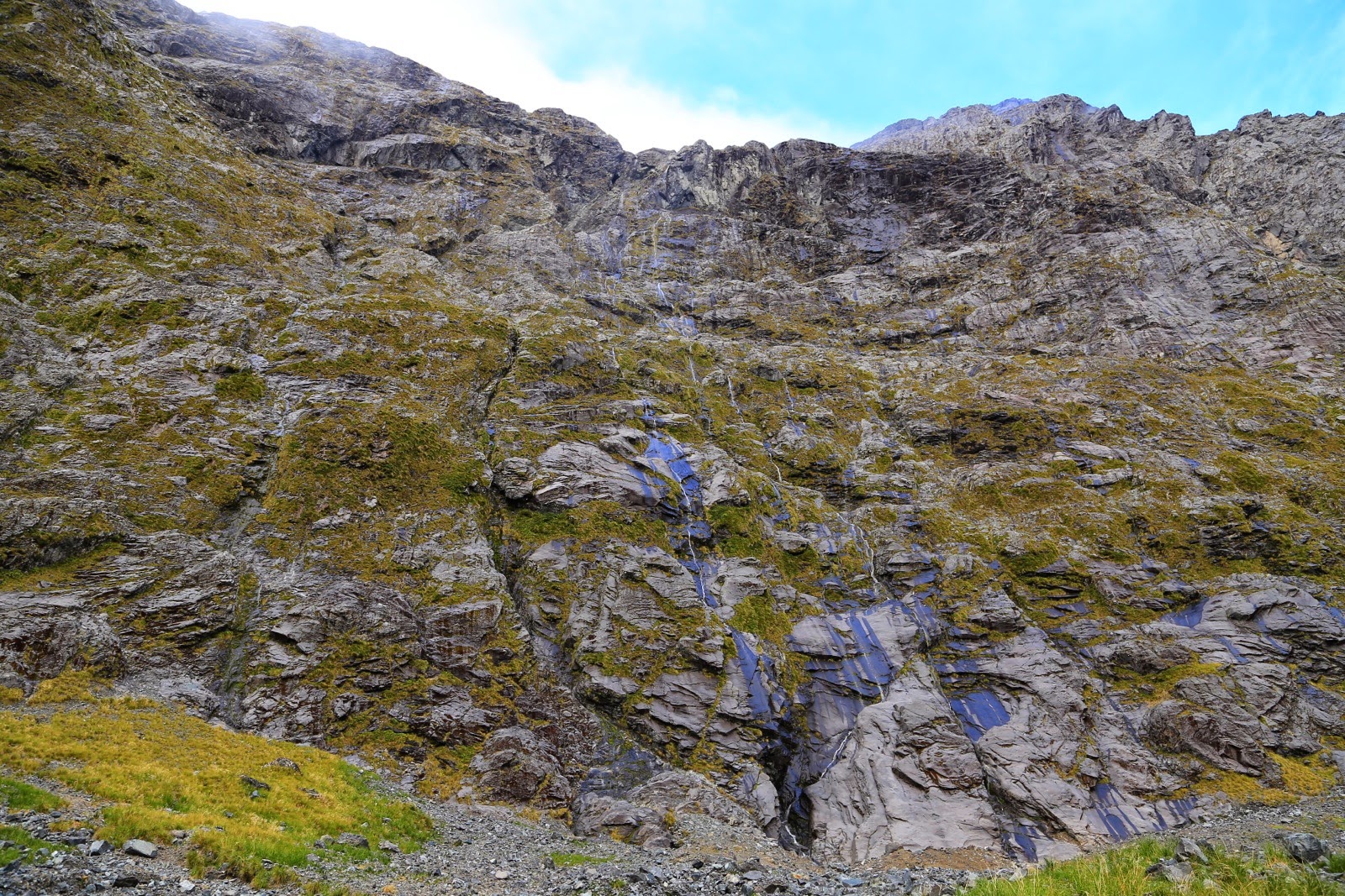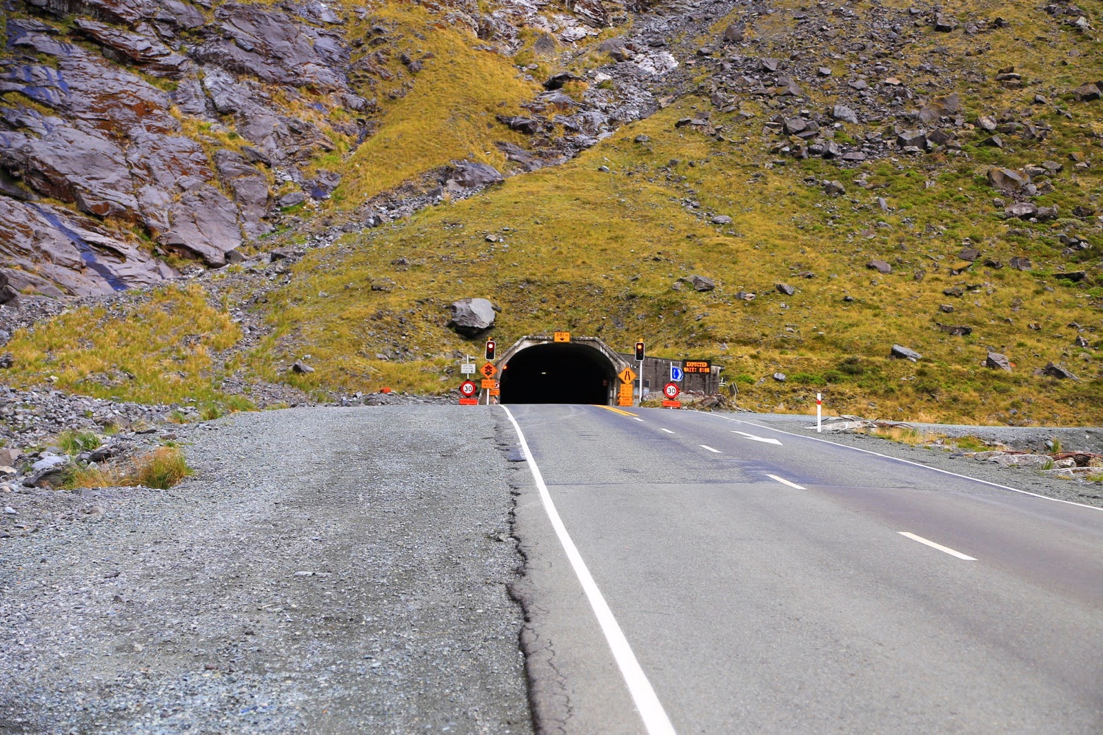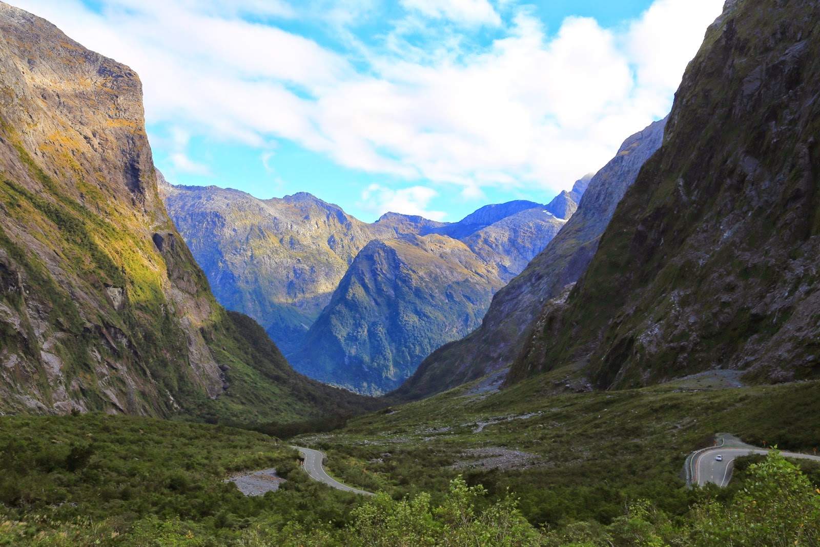 Dans l’ascension, on sent que le soleil essaye de percer les nuages et on distingue quelques trous de ciel bleu. La route est fantastique, on aperçoit les premières neiges éternelles et d’étroits ruisseaux qui coulent à la verticale le long de la roche comme si la montagne suintait de toute part. On passe le Homer Tunnel, un trou d’1,2 km descendant à l’intérieur de la montagne et juste assez large pour laisser passer un véhicule et juste assez haut pour les bus et les camping-car à capucine. De l’autre côté, le ciel vire au bleu et le soleil est enfin là !