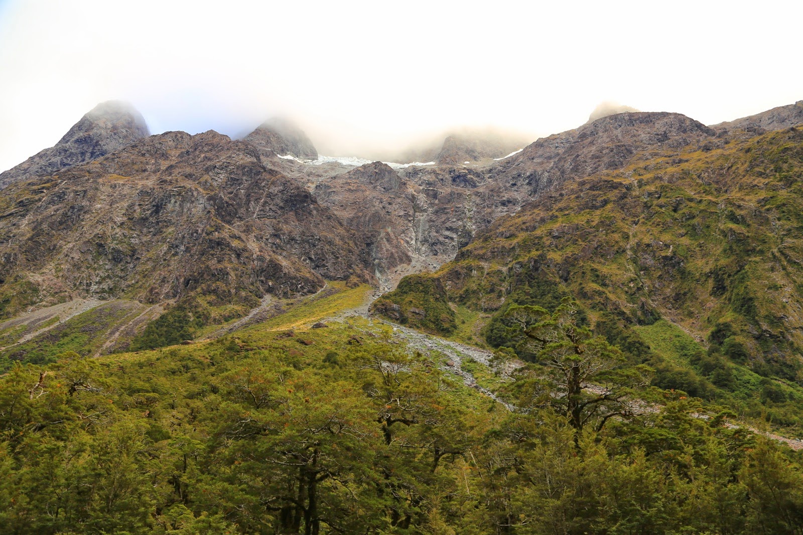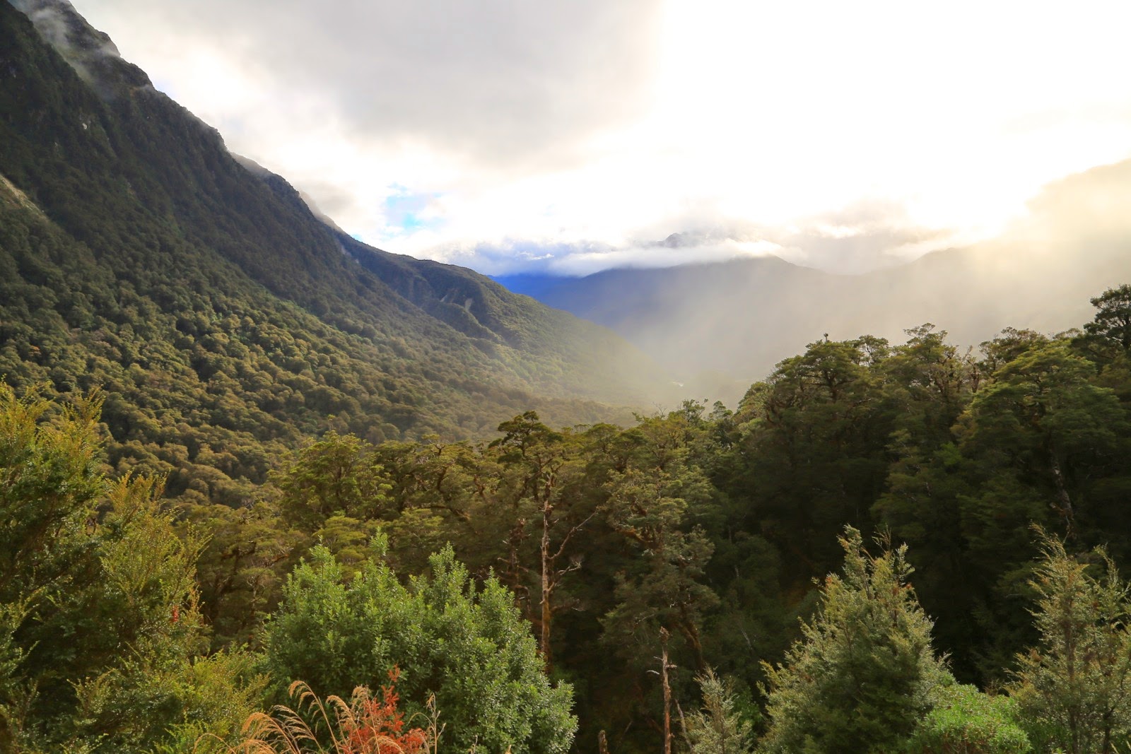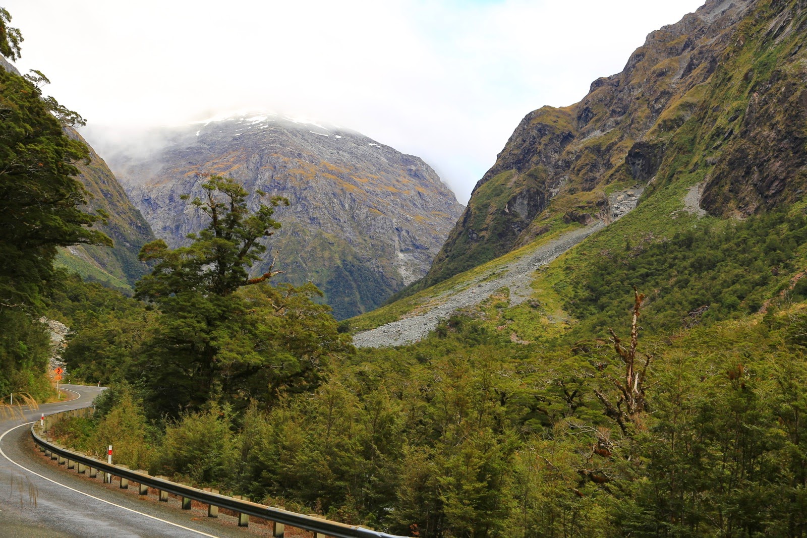 Avant d’attaquer la montée vers Milford, on passe la nuit dans un campsite (Cascade Creek) où l’on a déjà l’impression d’être au milieu de nulle part. La brume qui envahit les montagnes à notre réveil accentue encore davantage cette sensation. La météo est désastreuse, il fait froid, il pleut, il y a du vent et impossible de voir le sommet d’une montagne ! Mais on a déjà fait tous ces km et il n’en reste plus que 50 jusqu’à Milford Sound…