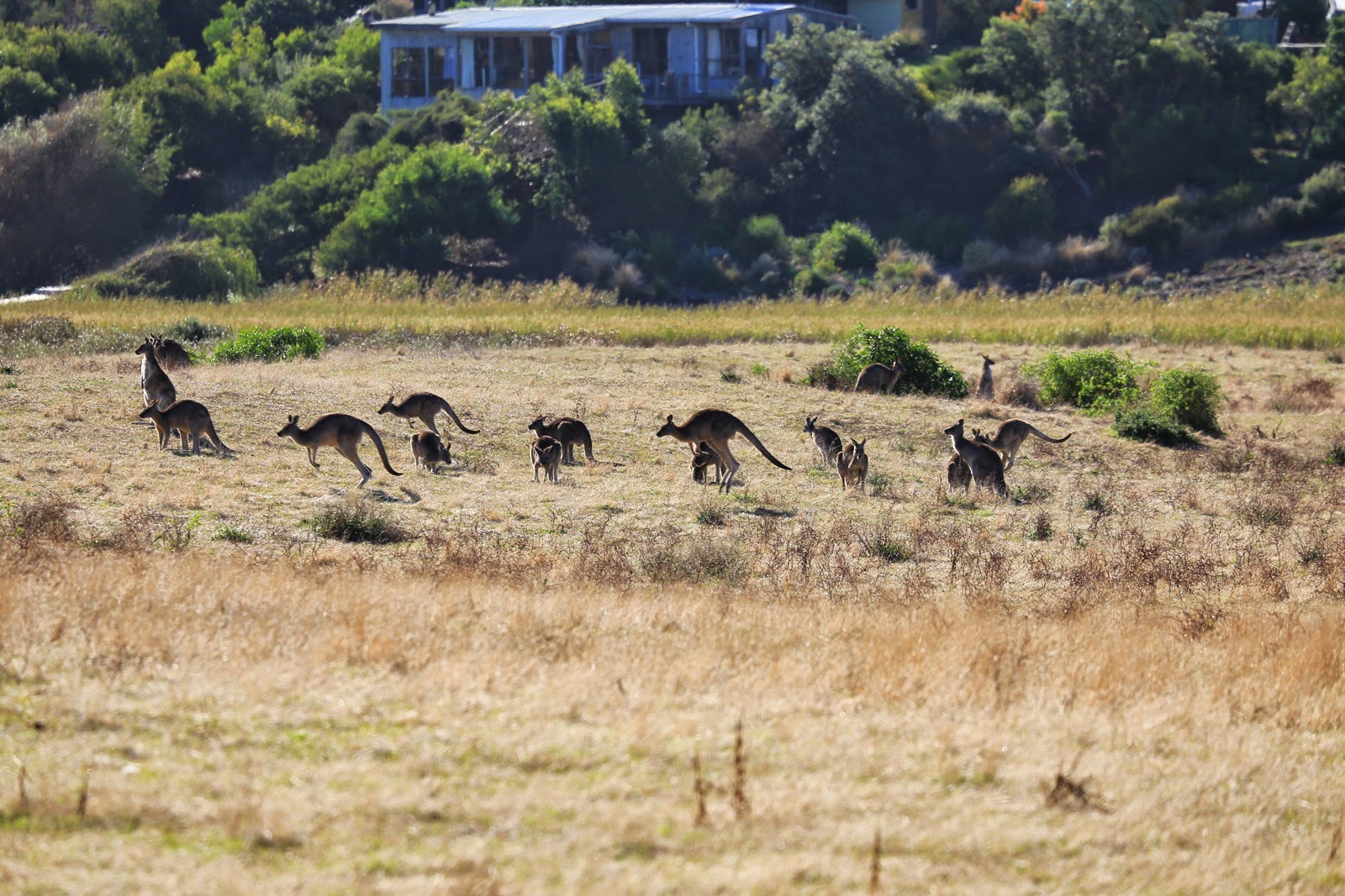 Le soir, on fait étape au camping de Princetown où l’on retrouvera notre gentil couple de Sydney. Je gare le campervan sur l’herbe près d’un immense champ et à quelques mètres, trois kangourous sont tranquillement installés et ne semblent pas du tout apeurés par mes manœuvres pour parquer mon engin. Plus tard, on découvre que le champ grouille de kangourous de toute taille qui sautillent allègrement. Pour les avoir observés, shootés, filmés pendant plus d’une heure, je peux désormais faire une thèse sur le déplacement de la bête et l’utilisation de sa fameuse queue !! Mais la nature est vache… quelle idée saugrenue de l’avoir flanqué d’aussi petites pattes avant, l’obligeant à se faire à un lumbago pour chercher à manger !!!
