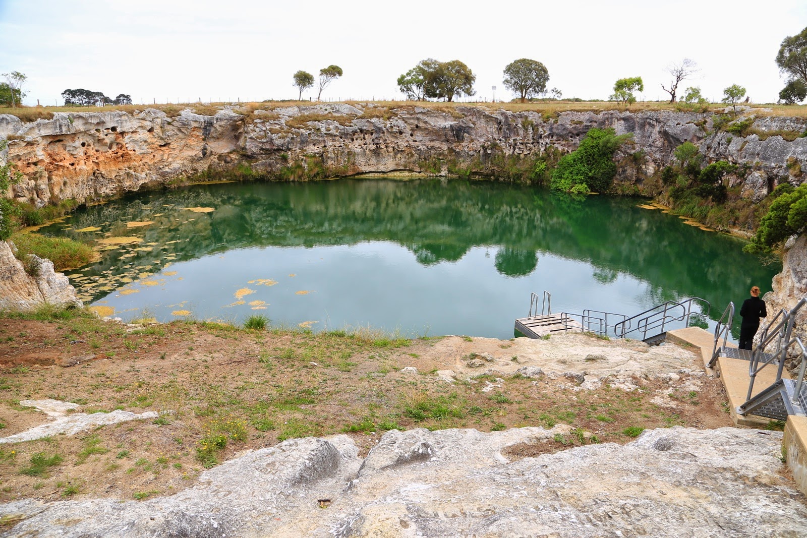 Stop 5, Beachport : on continue de visiter les phénomènes géologiques de la région, le Little Blue Lake tout d’abord qui est effectivement tout petit mais qui en cette matinée nuageuse semble plus vert que bleu ! Une algue est responsable de sa couleur et un panneau déconseille la baignade aux personnes sensibles de l’épiderme.
