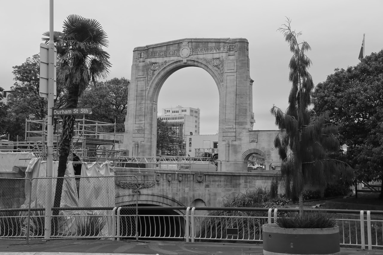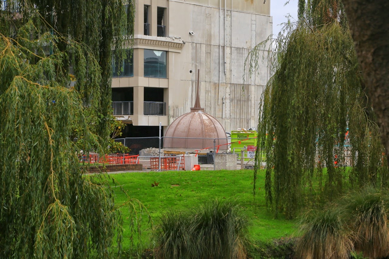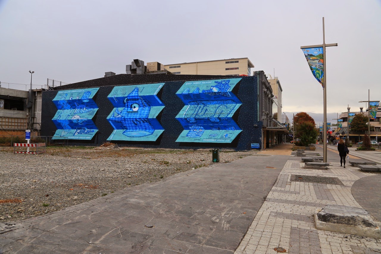C’est sous un ciel gris et une bruine qui tombe par intermittence qu’on découvre Christchurch. On a un peu de mal à trouver le centre, pourtant le GPS de l’iPhone nous indique que nous sommes tout près, à quelques centaines de mètres seulement de Cathedral Square. On se gare dans High Streetmais il n’y a presque personne dans les rues. On s’approche de la fameuse Cathédrale consacrée en 1881 et on découvre avec stupeur que sa flèche s’est totalement écroulée et le reste est soutenu par un échafaudage de poutres métalliques. C’est à ce moment qu’on se rappelle un reportage des Nouveaux Explorateurs vu sur Canal+ et que la ville a été frappée par un violent tremblement de terre le 21 février 2011. Prenant conscience de la tragédie, on regarde autour de nous et on comprend mieux les palissades et les grilles de chantier de (re)construction et les “trous“ laissés par les immeubles manquants. En passant devant les vitrines d’un Starbucks et d’un Foot Locker, on zieute à l’intérieur pour apercevoir des locaux dévastés et abandonnés par les clients comme si le séisme avait eu lieu hier !