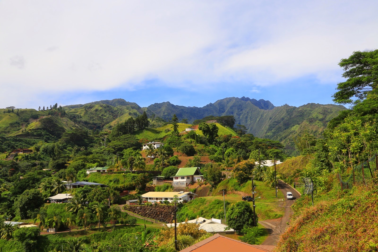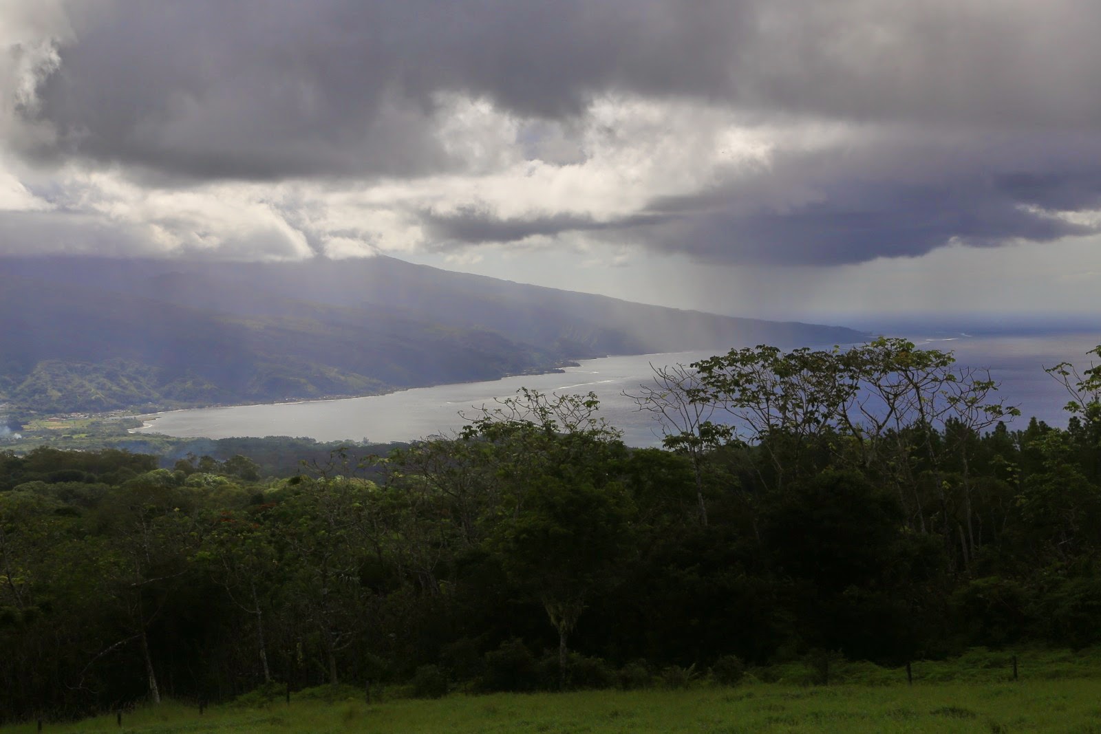 Sur les conseils de Marc-Antoine, on grimpera jusqu’au Plateau de Taravao situé sur la presqu’île au sud-est où l’on change radicalement de décor. Oubliez les cocotiers et les petites criques car on a clairement l’impression de se retrouver en Normandie avec d’immenses pâturages verts pétants sur lesquels broutent paisiblement quelques vaches. Même la météo s’en mêle avec des nuages bas et des pluies éparses pour compléter le tableau !!