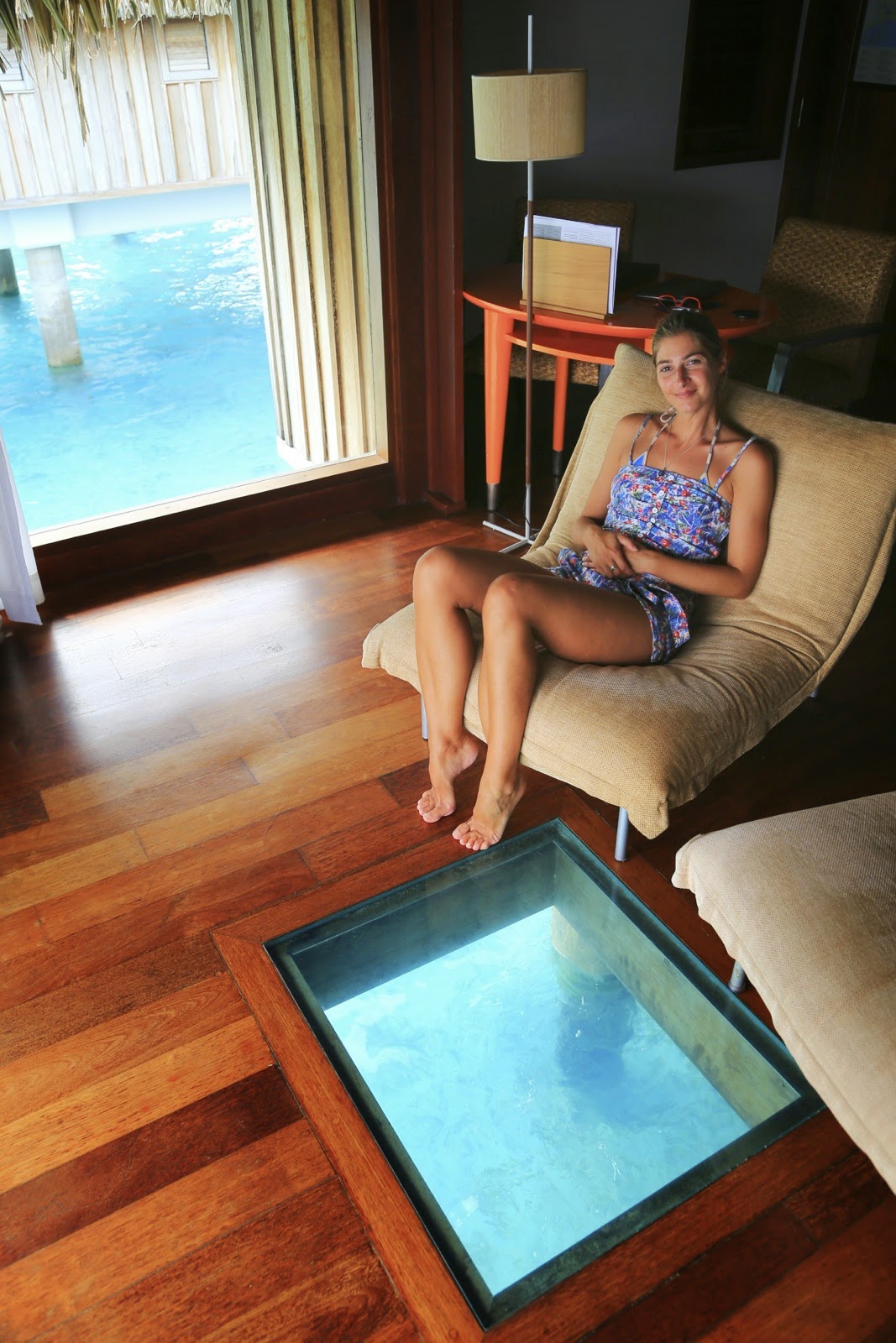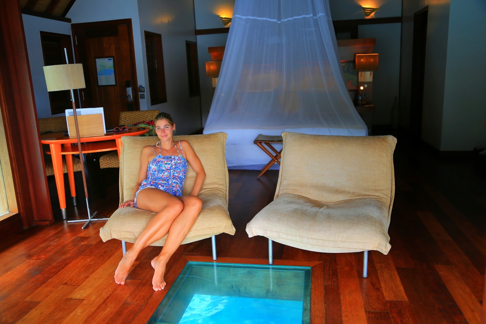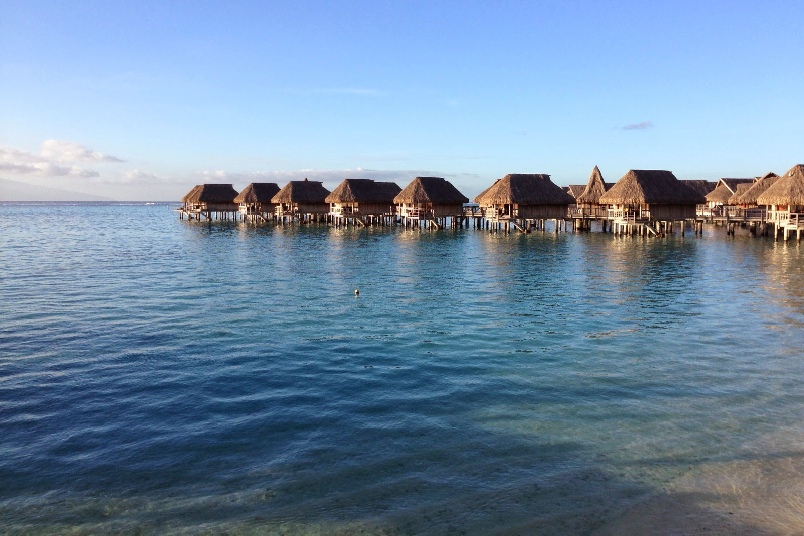 Pour notre mariage, des amis nous avaient offert deux nuits dans un bungalow sur pilotis à l’Intercontinental de Tahiti où se trouvait justement mon club de plongée (Topdive). Malheureusement, tous les bungalows pilotis étaient en cours de rénovation au moment de notre séjour. Mais ce n’est pas les hôtels qui manquent et Aude nous propose de passer le WE sur l’île de Moorea, elle connaît très bien par ailleurs les gens du Sofitel et réussit à nous obtenir in-extremis le dernier bungalow “Deluxe“ sur pilotis disponible. Nous restons donc 2 nuits pour la parenthèse honeymoon de notre voyage car c’est bel et bien le meilleur hôtel que l’on ait fait jusqu’à présent. La journée, outre 2 plongées au milieu des requins programmées de l’autre côté de l’île, nous avons essayé de profiter au maximum de notre bungalow en faisant la sieste sur la terrasse ou en explorant l’eau translucide et ses poissons en snorkling. Adèle nous a refait un remake de la pub pour Tahiti douche……… mais en gardant le maillot 😉