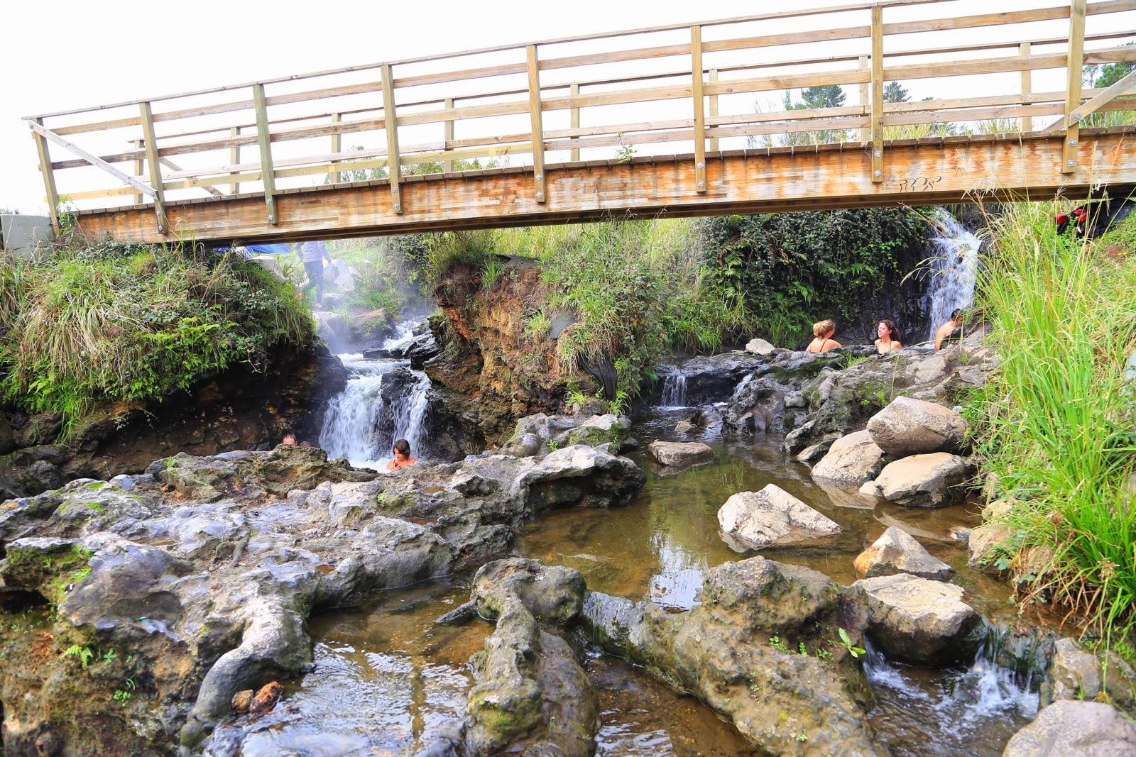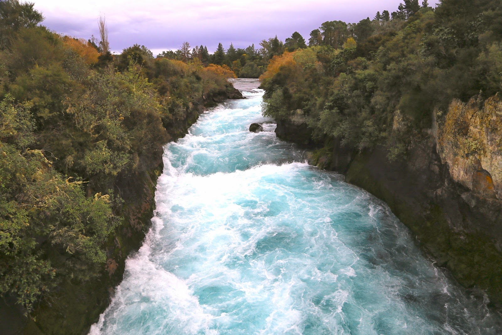 Notre roadbook étant assez serré, on se contente d’y déjeuner et de faire une petite marche au départ du Spa Thermal Park jusqu’aux Huka Falls. Sur le chemin, on croise des baigneurs qui profitent des 40° d’une source qui se jette dans la Rivière Waikato. Plus loin, les chutes ne sont pas très hautes (à peine 10 m) mais à cet endroit, la rivière se rétrécit pour devenir un torrent furieux bleu menthol qui rugit dans la gouttière étroite que forment les rochers. Le spectacle est assourdissant……… et hypnotisant !