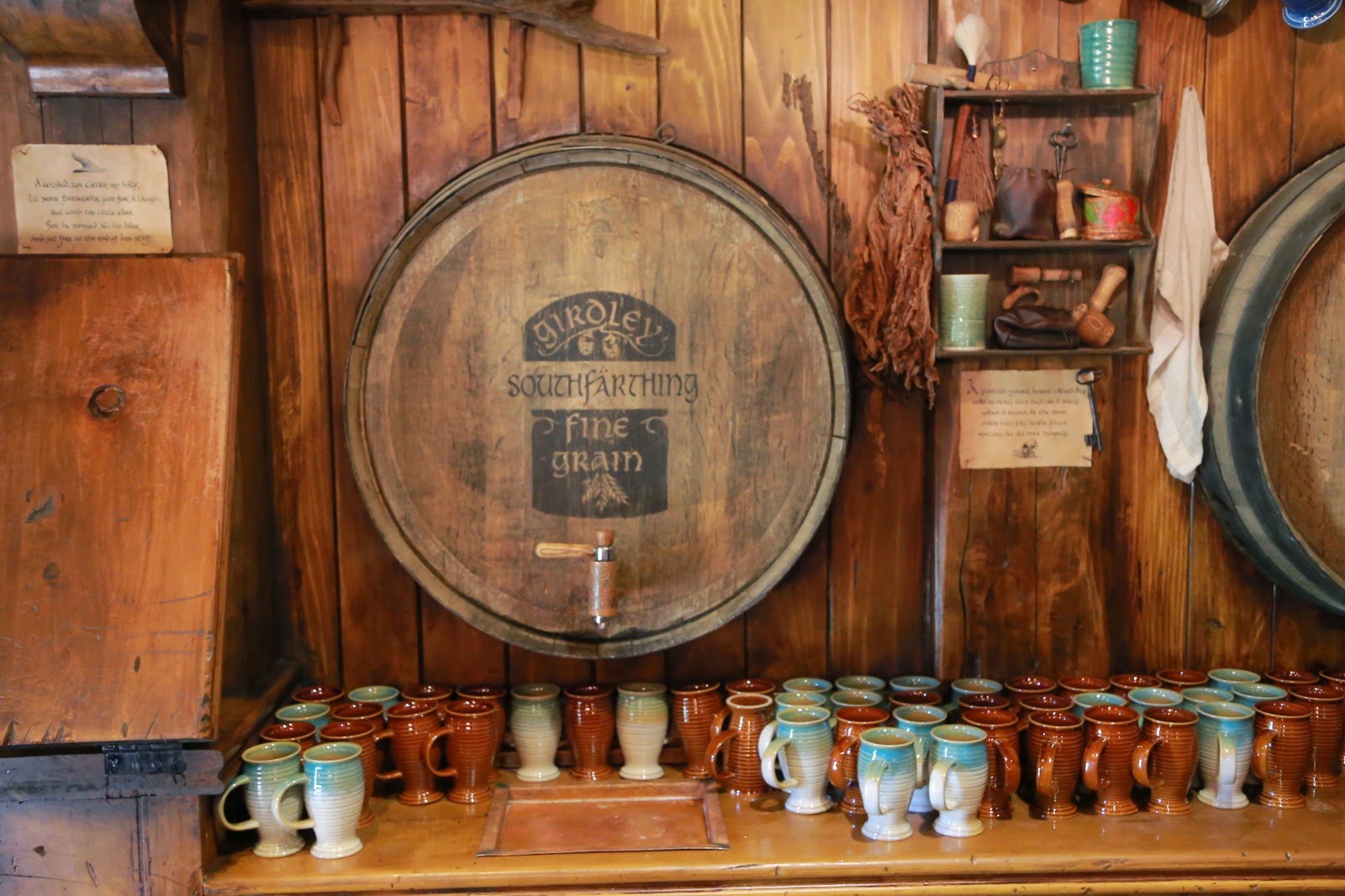 A l’origine il y avait 39 “trous“ de différentes tailles plus 5 construits lors du tournage du Hobbit. L’arbre au-dessus de “Cul-de-sac“ est totalement artificiel réalisé à partir du moulage d’un chêne avec du silicone autour d’une structure en acier. On y apprend d’autres astuces et secrets de construction mais il ne me faut pas longtemps pour revoir les images du film et notamment la fête du premier opus où Bilbon disparaît au pied d’un (vrai) arbre centenaire. Les détails de fabrication des maisonnettes sont hallucinants et on a vraiment l’impression que des petits hommes ont vécu dans ce village. Si ce n’est que passé la porte d’un “trou“, il n’y a strictement rien et que l’espace n’est pas plus grand qu’un placard à balais !! Seul l’entrée de “Cul-de-sac“ a été légèrement décorée en raison des angles de prise de vue, tout le reste ayant été filmé aux studios de Wellington.La visite dure 1h30 et se finit par une bière artisanale offerte à la taverne du Dragon Vert. Les explications sont claires et il y a même un feuillet en français pour ceux qui ne comprendraient pas l’anglais du guide ! Bref, je reviens enchanté à la boutique de souvenirs avec l’envie de tout acheter, y compris le bâton de Gandalf ou le “précieux“ anneau avec les inscriptions elfiques, vendu 150 $ !! Mais Adèle m’aurait tué…