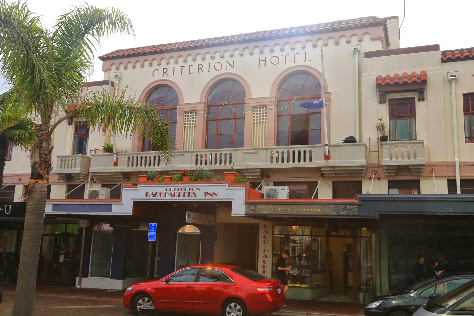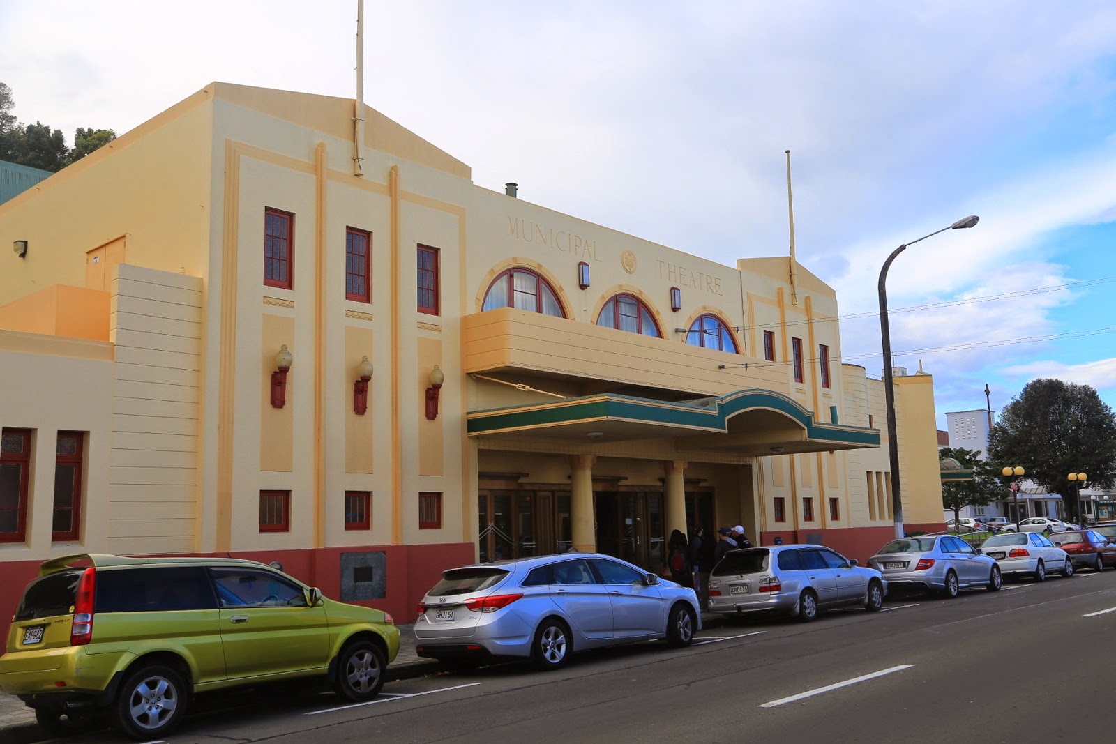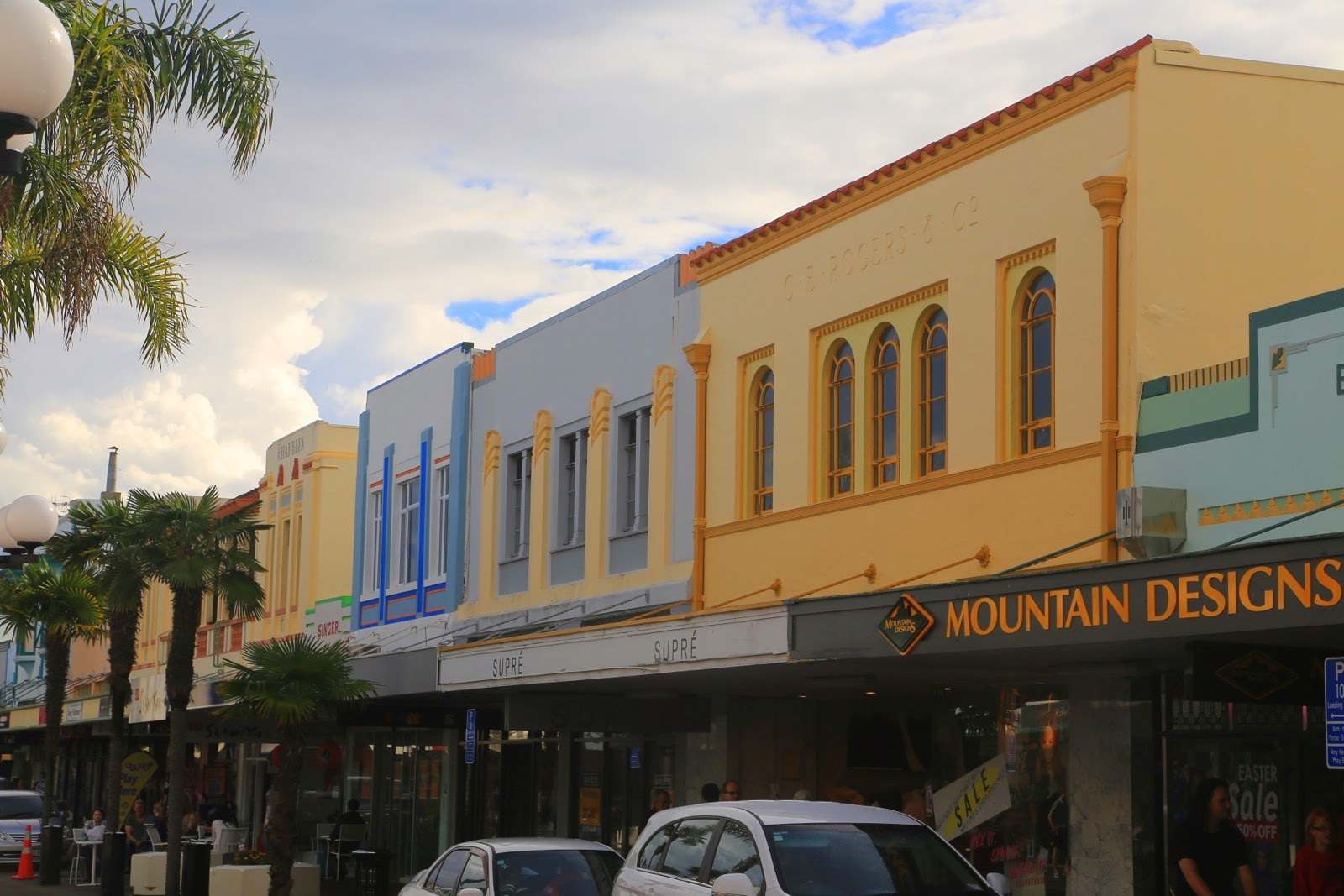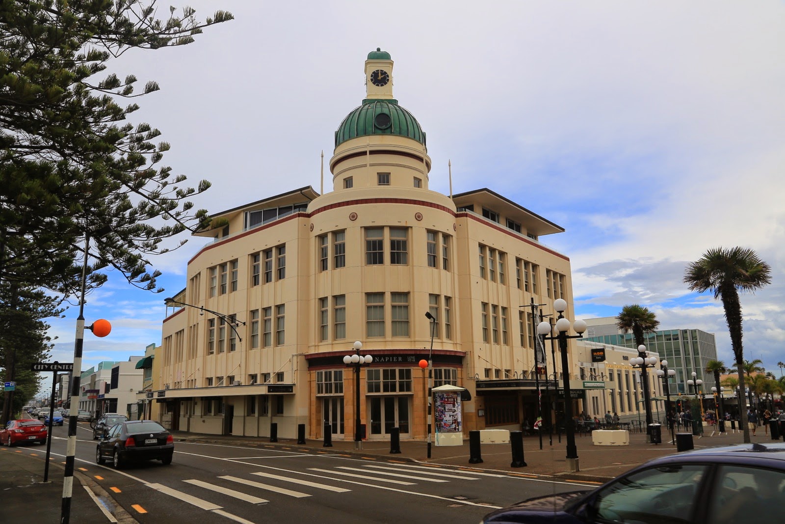 Nos potes belges, Astrid et Bruno, nous avait conseillé la visite de Napier, qu’ils n’avaient pas pu découvrir mais qui est réputée pour l’architecture de ses bâtiments. Le centre ville a été entièrement reconstruit après le terrible tremblement de terre de 1931 dans un style Art Déco tout en mélangeant des motifs anciens tels que mayas, égyptiens et même maoris. Se balader dans les rues de la bourgade est un saut dans le passé et on s’émerveille devant chaque façade peinte en couleurs pastel. On suit sagement le tracé du Lonely qui nous explique l’origine des immeubles car nombreux sont ceux qui n’ont plus leur vocation d’antan, comme l’Hotel Central qui, derrière ses murs crème aux motifs roses, abrite désormais un club de striptease et de massage !!! Beaucoup de ces très beaux bâtiments sont d’ailleurs à louer.