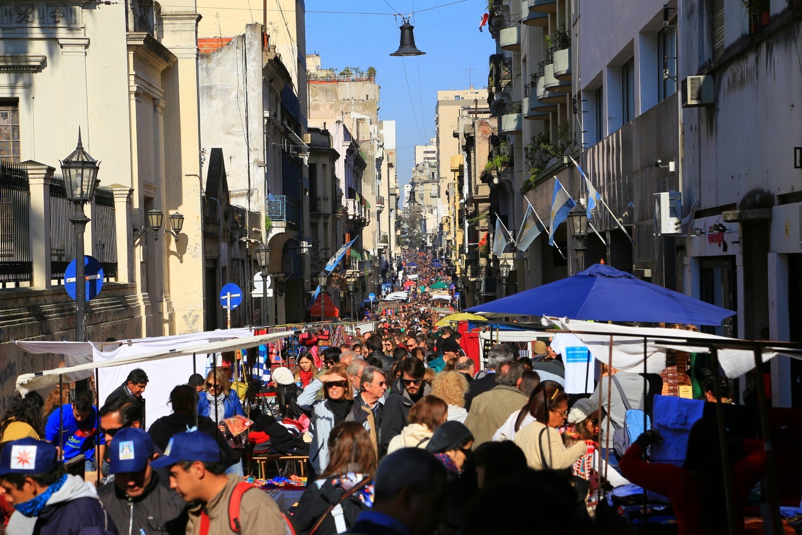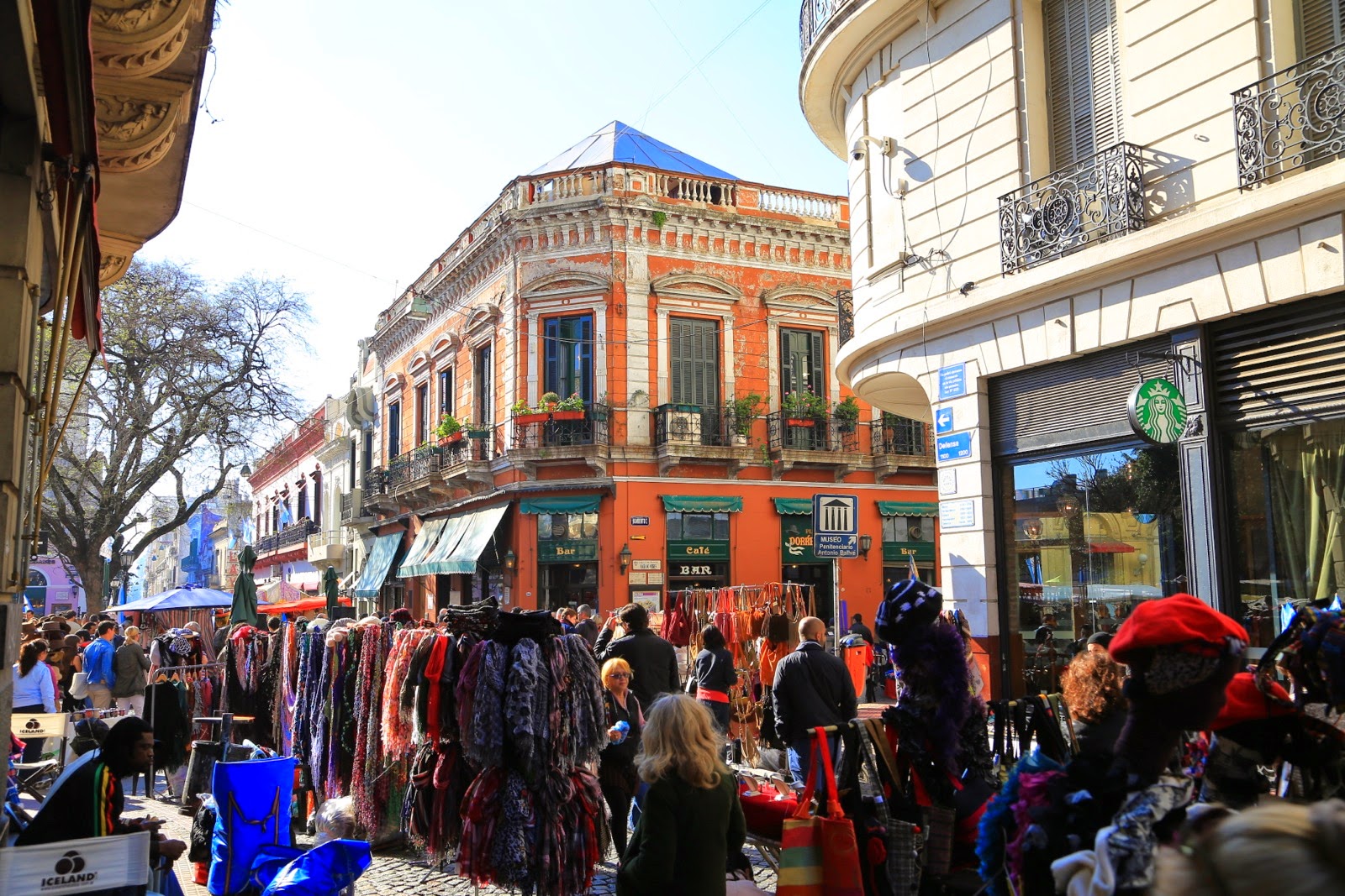 En prenant par Defensa, l’une des rues perpendiculaires à la place, on rejoint le quartier de San Telmo, célèbre pour ses échoppes d’antiquaires, ses rues pavées et ses maisons basses coloniales qui lui confèrent un charme d’antan. En ce jour particulier, l’étroite et longue rue s’est transformée en marché et il faut se frayer un chemin parmi la foule. Aux coins des avenues ou devant les parvis des églises du quartier se produisent des musiciens ambulants qui font se déhancher les passants attentifs.
