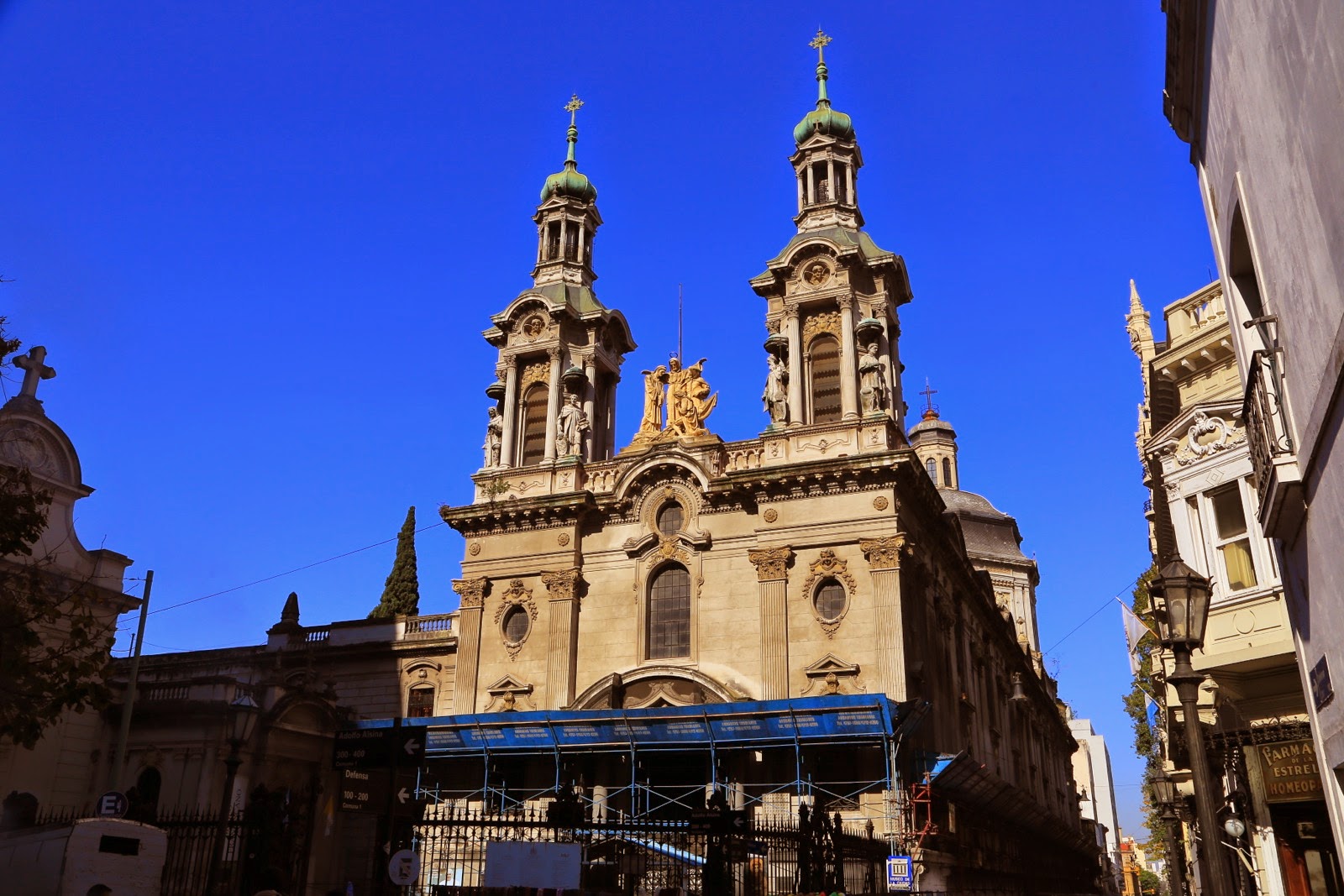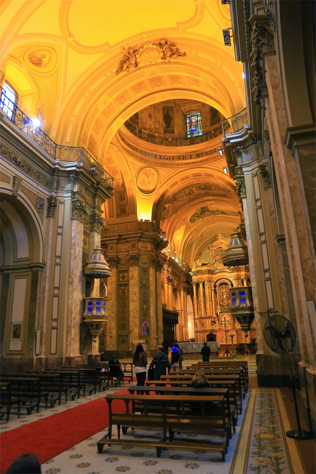 Par rapport au rassemblement de la veille, la Plaza de Mayo semble désespérément vide, dominée par la tour carrée aux 4 horloges du Palacio de la Legislatura de la Ciudad de Buenos Aires (1931). Au moins, on profite d’une vue dégagée sur ses monuments comme le Cabildo, hôtel de ville au XVIIIe siècle et reconverti depuis en musée. On accède enfin à la très baroque Catedral Metropolitana (1791) dont l’imposant portique néoclassique est inspiré du Palais Bourbon. La construction assez chaotique a nécessité près de 100 ans pour enfin s’achever en 1791 après quelques effondrements et autres négligences !! A l’intérieur, on démonte les tapis rouges déroulés pour la cérémonie de la veille et on s’émerveille de la richesse du style colonial espagnol avec ses ornements, ses peintures, ses voûtes et sa coupole. Dans le vaisseau droit, les Porteños se recueillent sur la tombe du général José de San Martin, grand héros de la Nation, veillé par des soldats en armes et dont la mémoire est commémorée également à l’extérieur par une flamme éternelle qui brûle sur la droite du parvis.