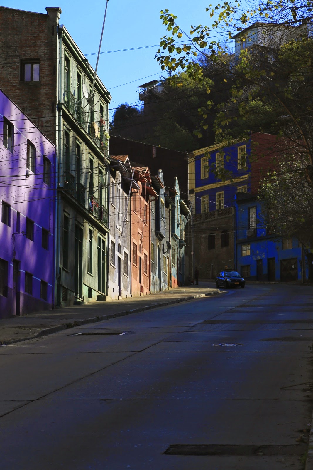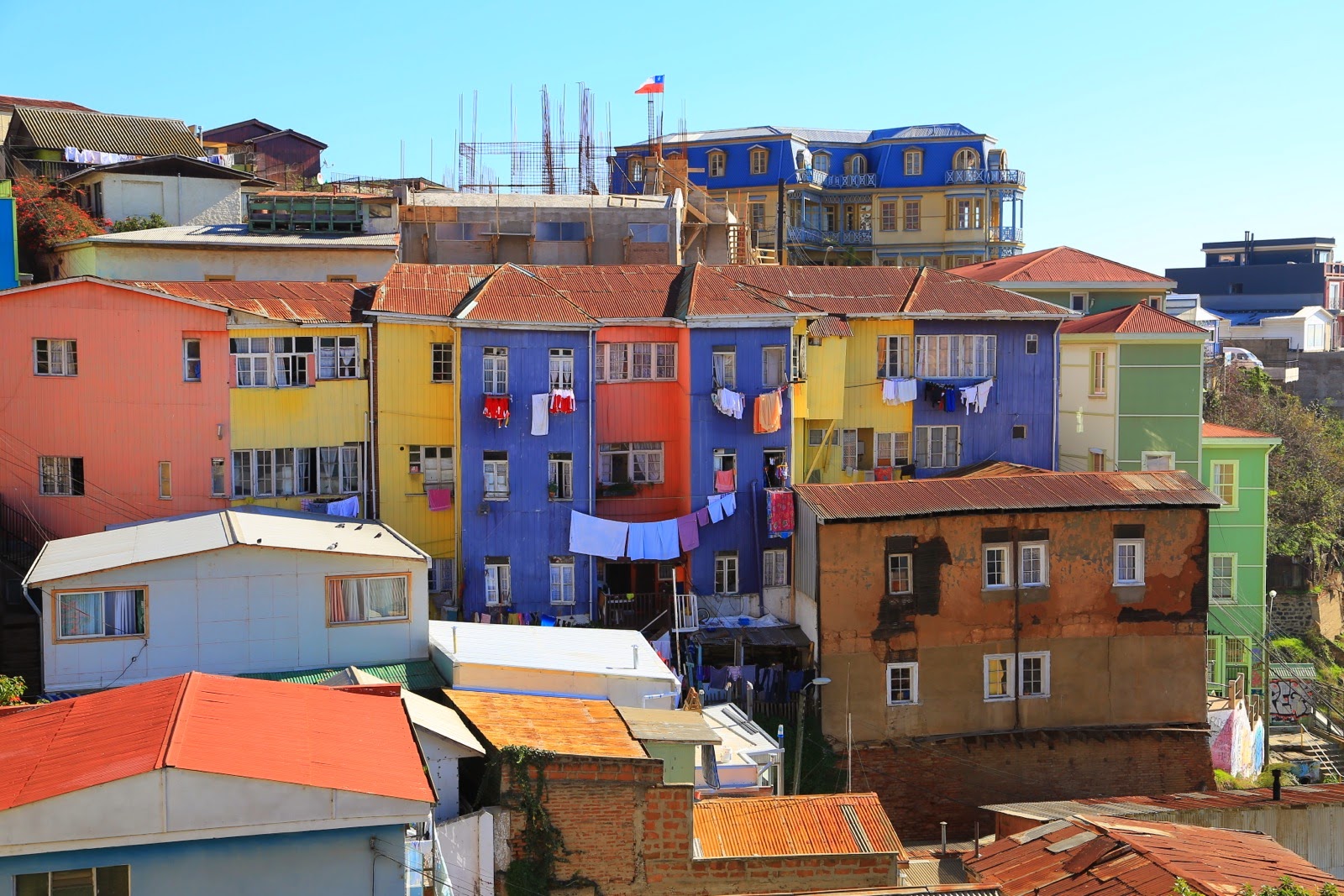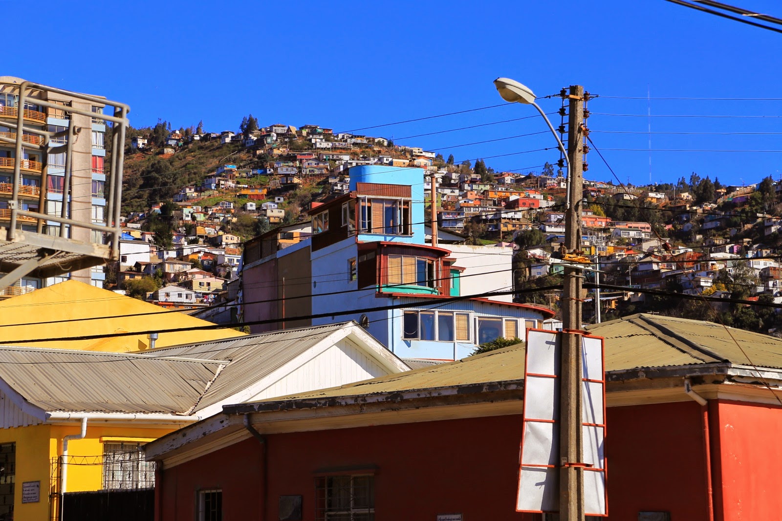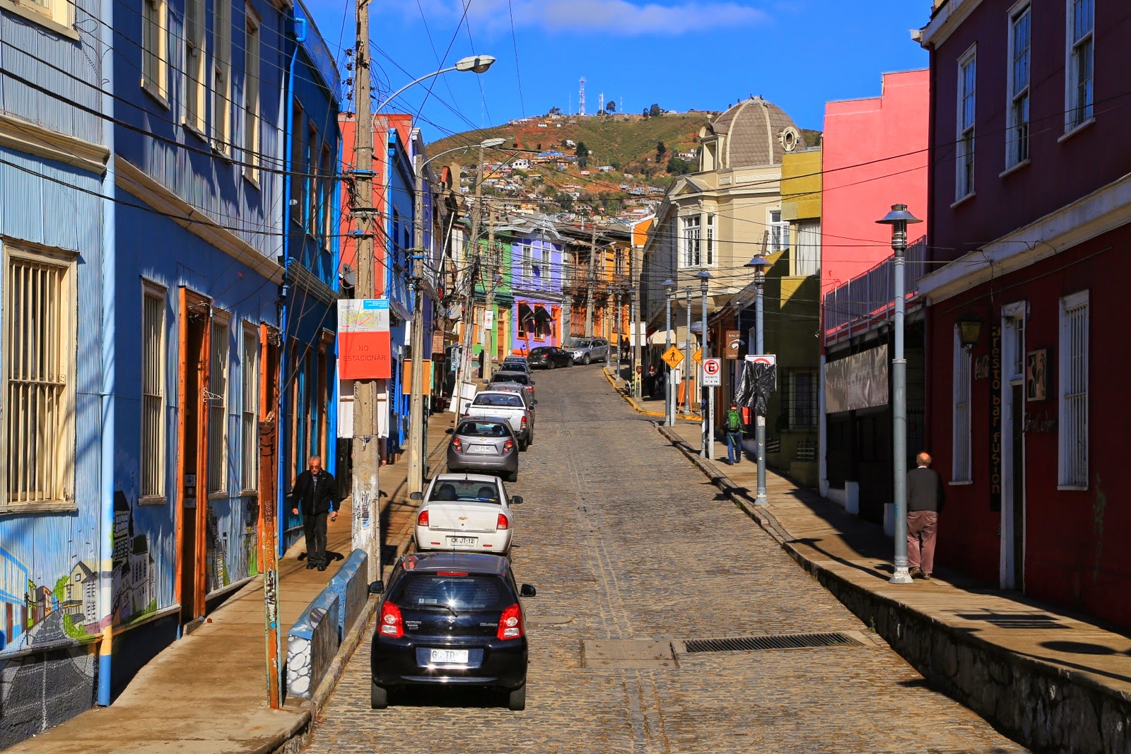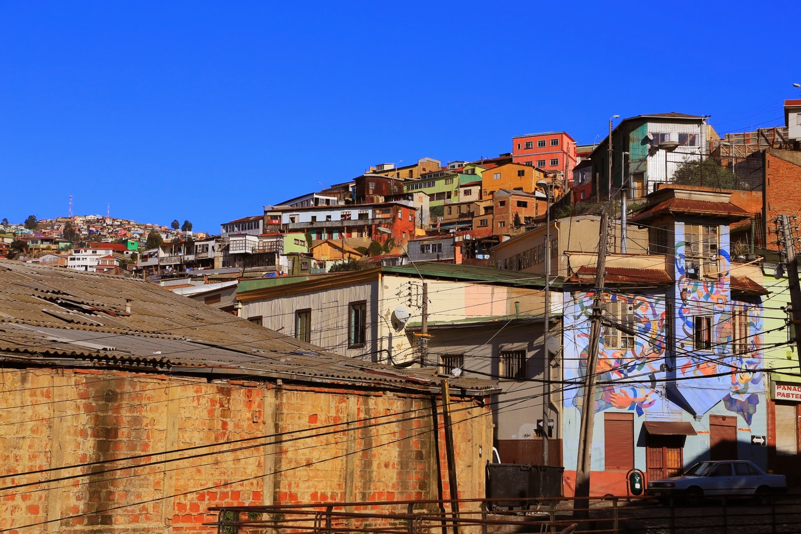Quand on arrive à Valparaísopar l’autopista de Casablanca, on débarque dans El Plan, la partie “plane“ de la ville et on ne se rend compte ni de l’étendue de l’agglomération, ni de ses reliefs. C’est en prenant un peu de hauteur pour rejoindre notre guesthouse qu’on découvre des milliers de maisonnettes en briques et tôles colorées littéralement accrochées sur les 42 cerros que compte « Valpo ».