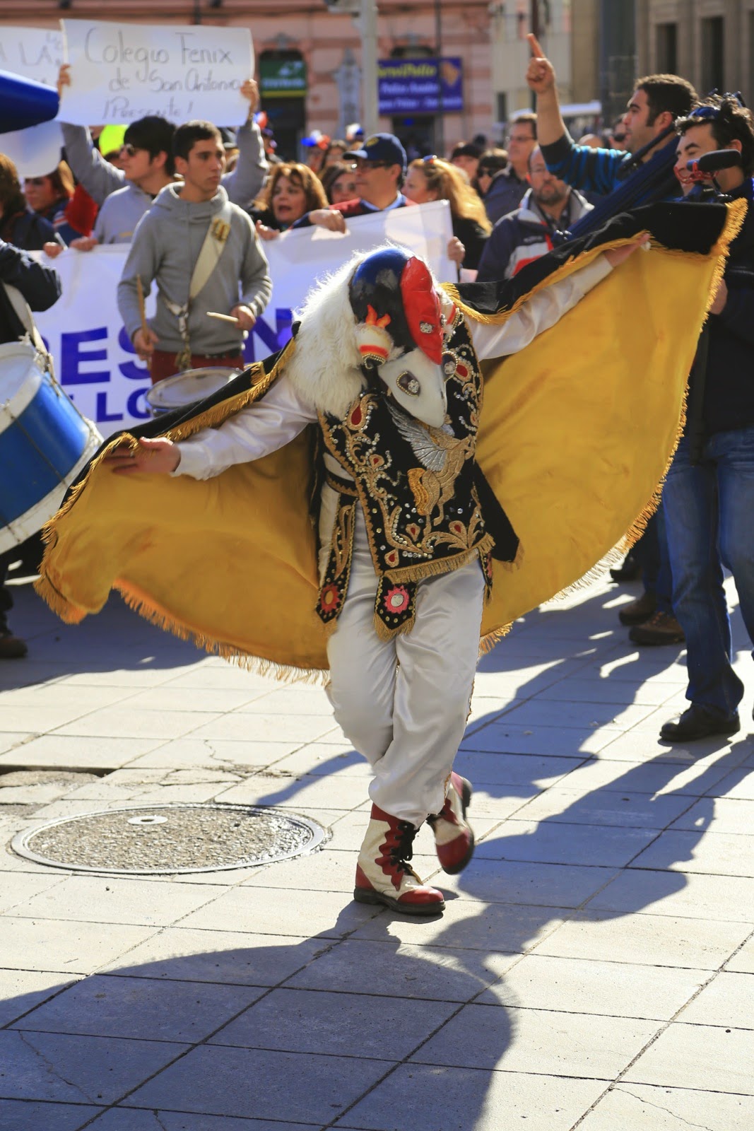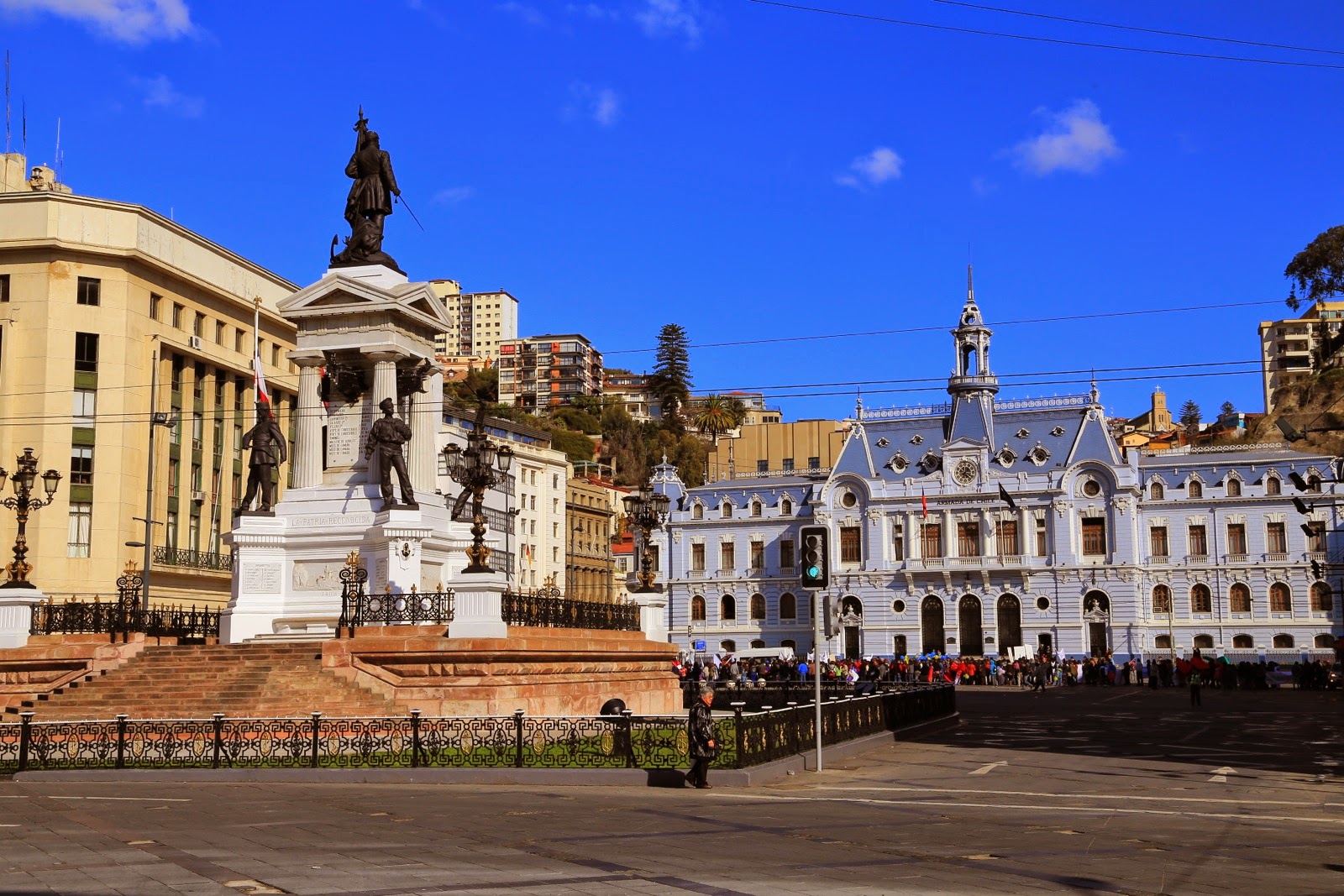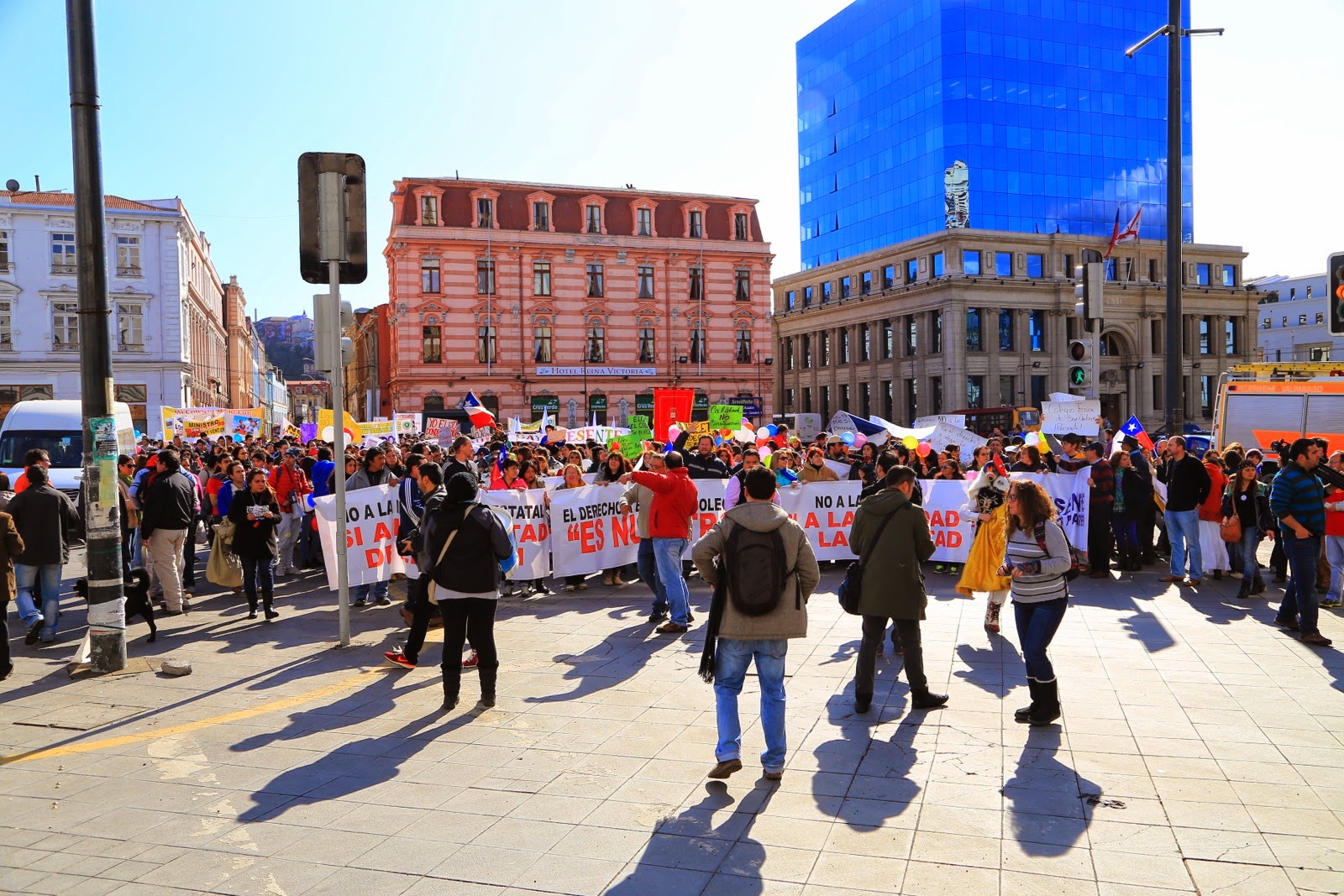 Sur la Plaza Sotomayor, je me dépêche de faire quelques clichés du remarquable Edificio de la Comandancia Naval avec ses façades bleues avant que la place ne soit envahie par une manifestation contre la réforme de l’éducation. L’ambiance est bon enfant, les mères défilent avec leur enfant sur les épaules et d’autres dansent en rythme au son des tambours et des trompettes.