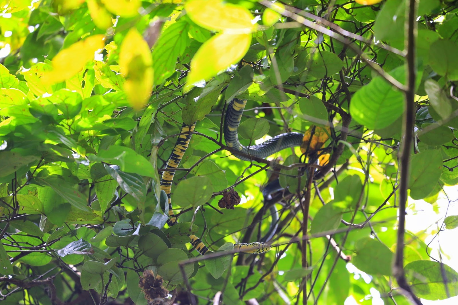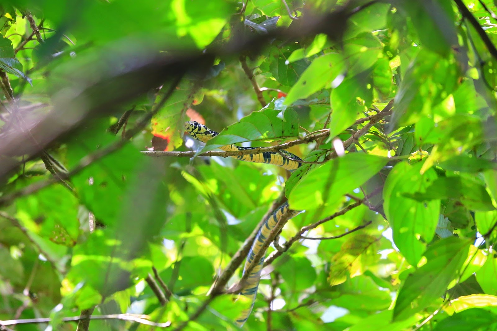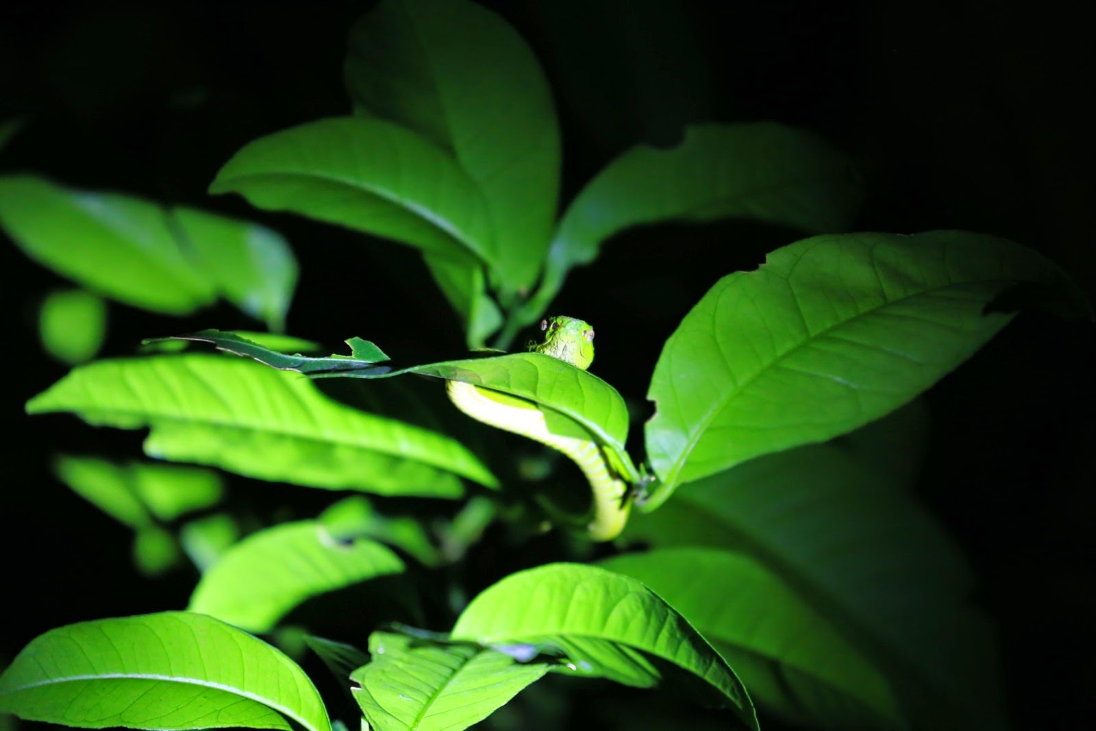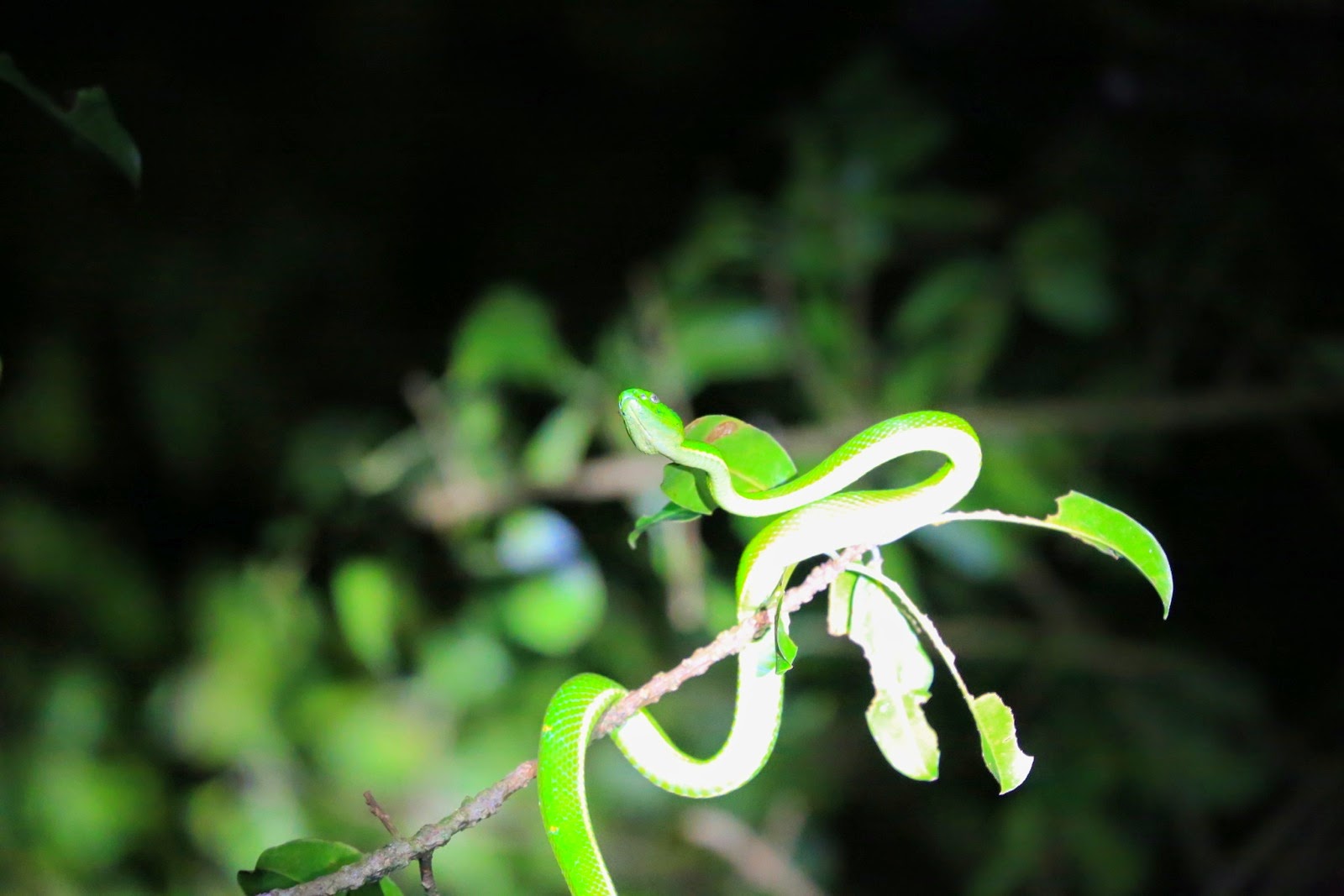 Dès notre arrivée, on s’inscrit pour une marche nocturne, le soir même, où l’on fait la connaissance d’Helen et Tiffany, 2 américaines de Los Angeles. A la seule lumière de nos torches, on se promène dans la jungle à la recherche de bestioles en tout genre. Notre guide exalté et totalement passionné par son job, nous fait ainsi découvrir des tarentules aux pattes velues, des insectes (phasmes, scorpions, papillons…), des toucans endormis et des serpents tout verts qu’il est extrêmement difficile de distinguer, s’entremêlant dans les feuilles à quelques centimètres au-dessus de nos têtes.