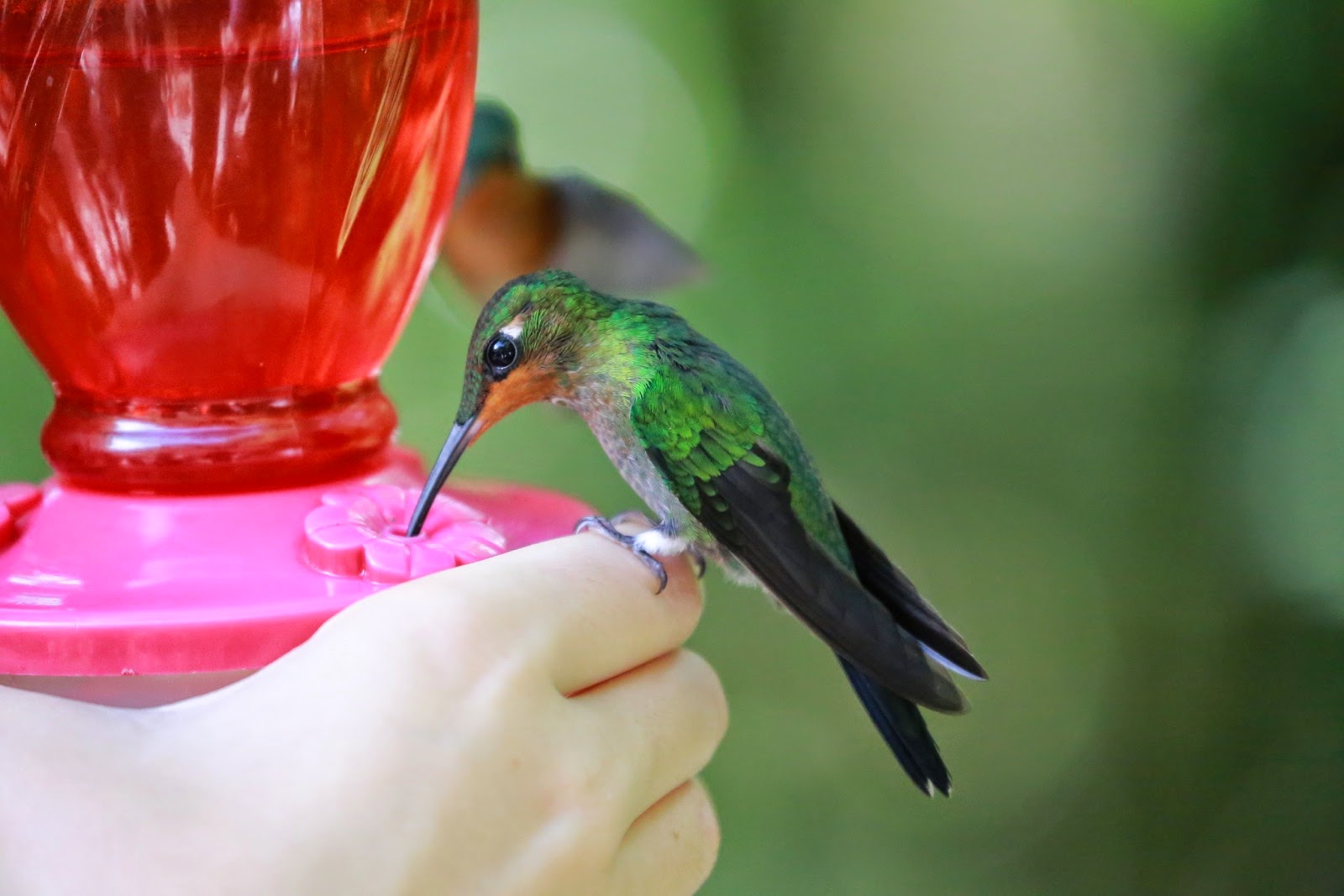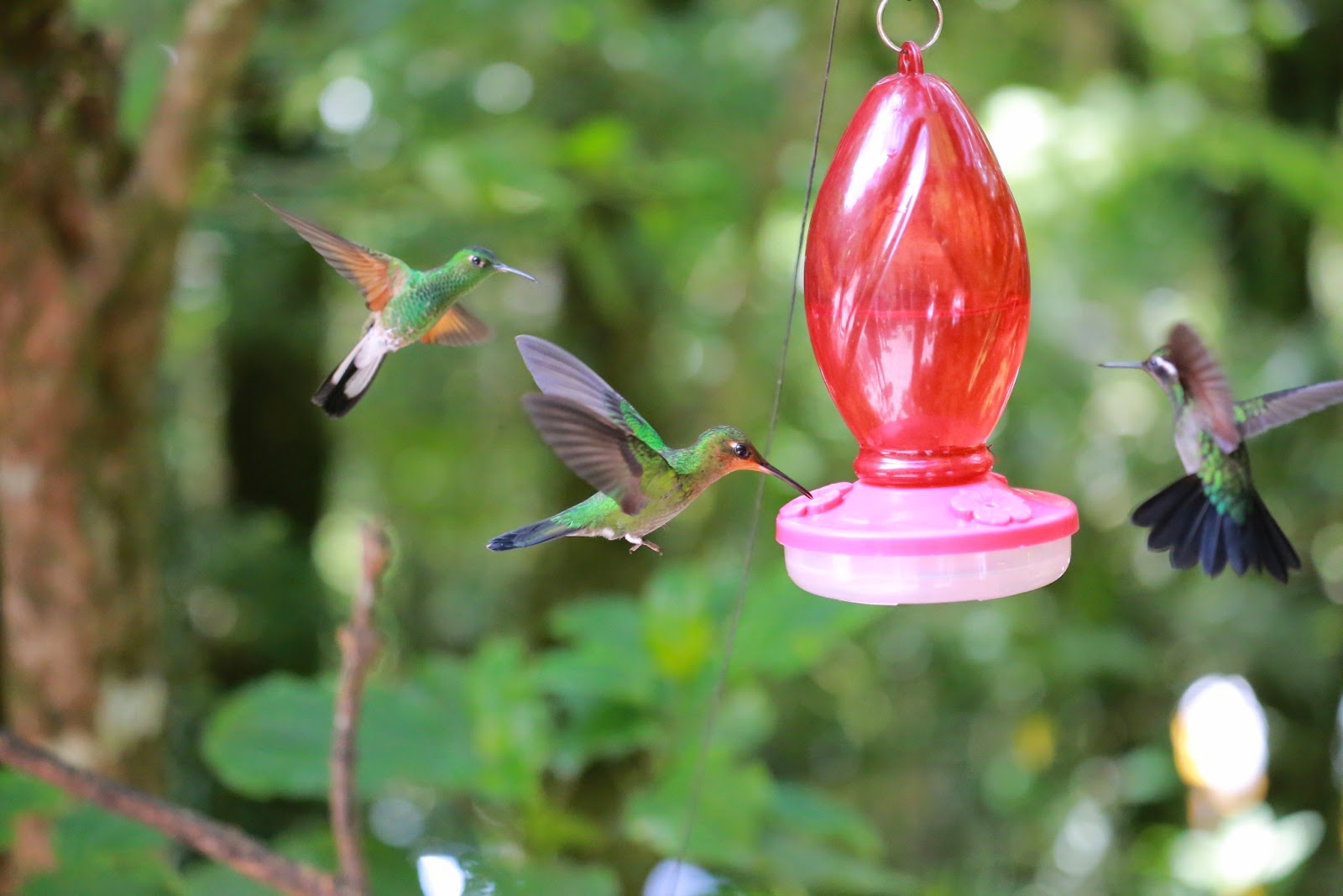 Le reste pourrait paraître (presque) banal, des insectes énormes, des paresseux pas si paresseux, encore des singes, des fougères géantes, des troncs d’arbres qui font la grimace, l’orchidée la plus petite du monde… et la visite se termine par le spectacle impressionnant de dizaines de colibris qui volent frénétiquement autour de points d’eau artificiels. La vitesse des battements de leurs ailes est tout bonnement hallucinante et c’est la première fois que je dois régler mon reflex sur sa vitesse d’obturation la plus élevée pour tenter d’avoir un cliché à peu près net !!