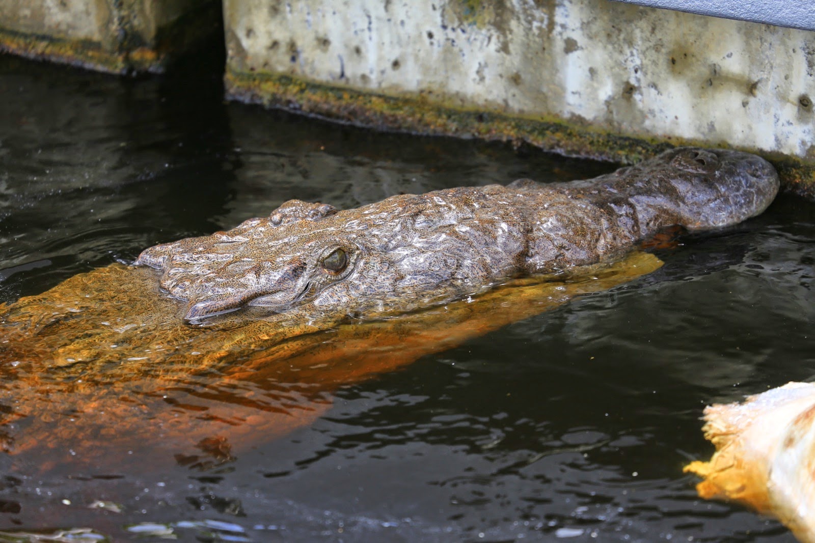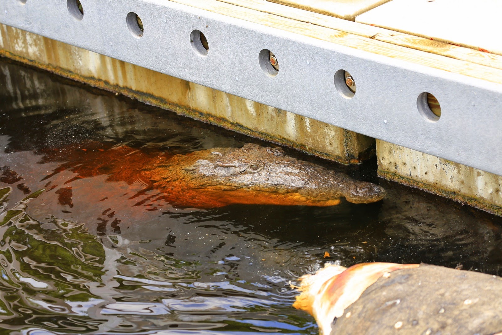 En tout cas des crocodiles à garder, il y en a plein les mangroves et les marais du Parc National des Everglades. Notre premier contact avec l’un d’eux fut légèrement morbide puisque la bestiole boulotait les restes d’un lamantin décapité qui flottait dans le minuscule port à côté du Flamingo Visitor Center !! Notre croco, d’un bien beau gabarit, avance sournoisement au milieu des pontons, émergeant avec ses 2 yeux inexpressifs avant d’arracher un morceau de la pauvre bête et de repartir aussi lentement qu’il était venu.