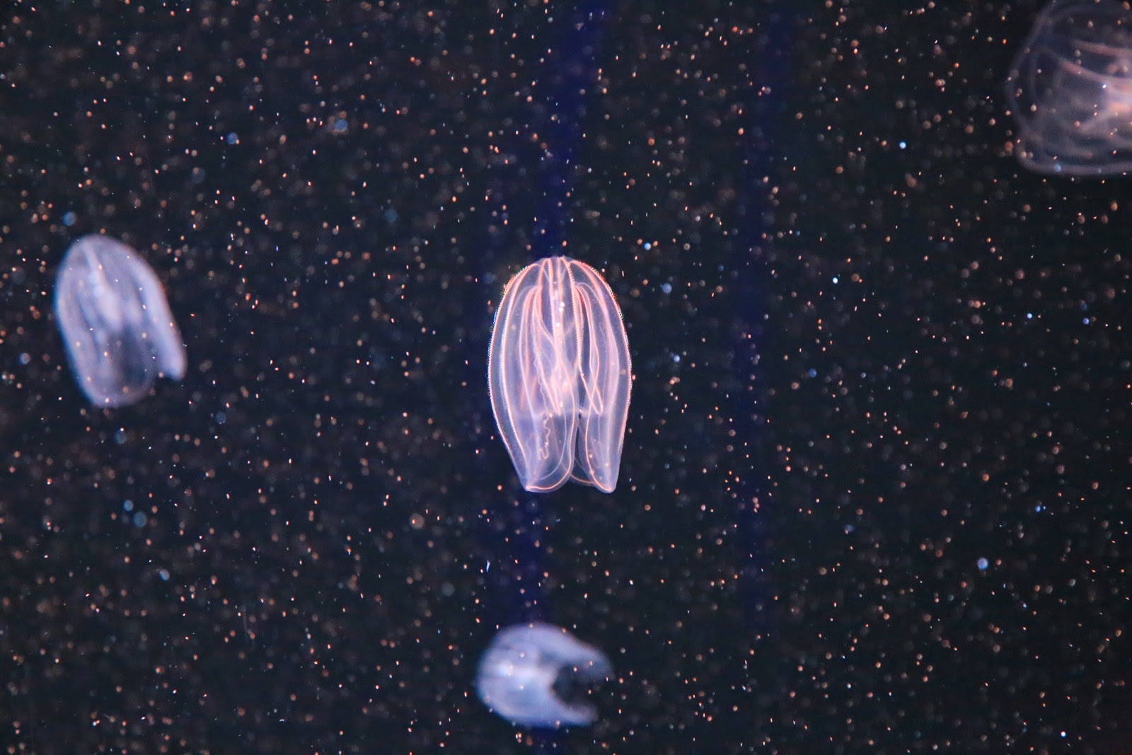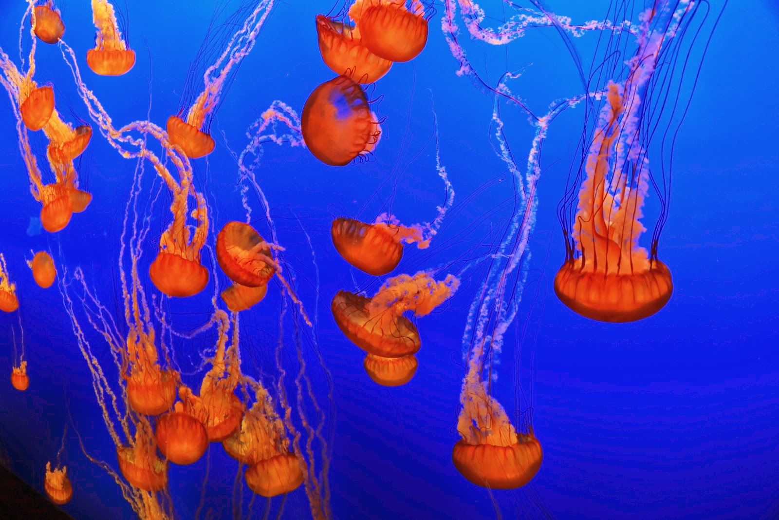 Mais déjà on arrive à Montereyoù l’on fait étape pour en visiter l’aquarium à priori réputé. C’est qu’on en a déjà fait quelques uns et il faudrait qu’il soit vraiment exceptionnel pour nous épater ! Et bien c’est clairement le cas !!! Dès l’entrée, on est plongé dans le monde fascinant des méduses avec The Jellies Experience qui nous fait oublier la sale bestiole qui nous avait piqué à 12 ans sur une plage d’Andernos !! Des dizaines d’aquariums sont remplis de toutes sortes de cnidaires mis en scène dans des ballets incroyables alliant la grâce envoûtante de leur déplacement à leur forme parfois répugnante. C’est décidé, si un jour on retente l’expérience d’un aquarium chez nous, on y mettra des méduses pour s’hypnotiser pendant des heures derrière la vitre !