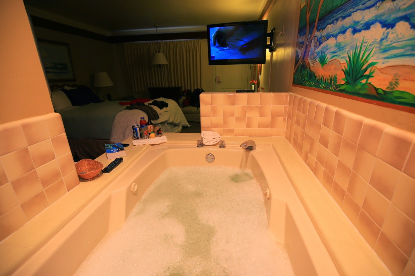 On reste à Montereypour la nuit dans un motel qui remporte la palme de « la plus énorme baignoire de notre voyage » (sur la photo ça ne rend pas trop !!!) où Adèle et moi tenons facilement côte à côte pour regarder la télé et le match Djoko-Murray en quart de finale de l’US Open tout en sirotant une michelada. Le lit extra king size est à l’image de la baignoire et la fausse cheminée où rougeoie un feu artificiel est aussi kitsch que la fresque murale qui surplombe notre bain ! Un motel quoi…