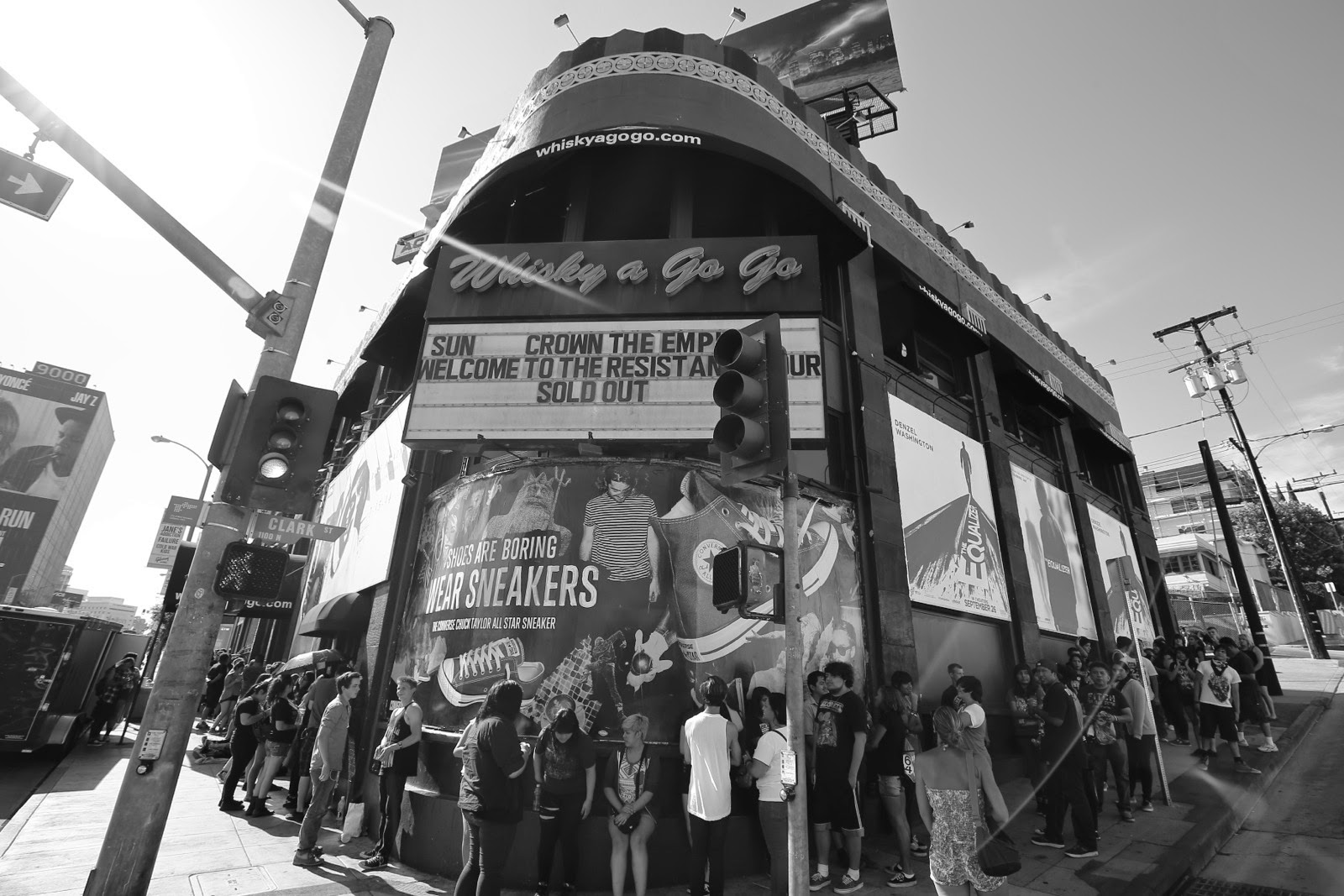 En rejoignant Sunset Blvd, on s’arrête devant des monuments de la musique comme The Roxy ou le Whisky A Go Go où la foule fait déjà la file pour le concert du soir de Crown the Empire.
