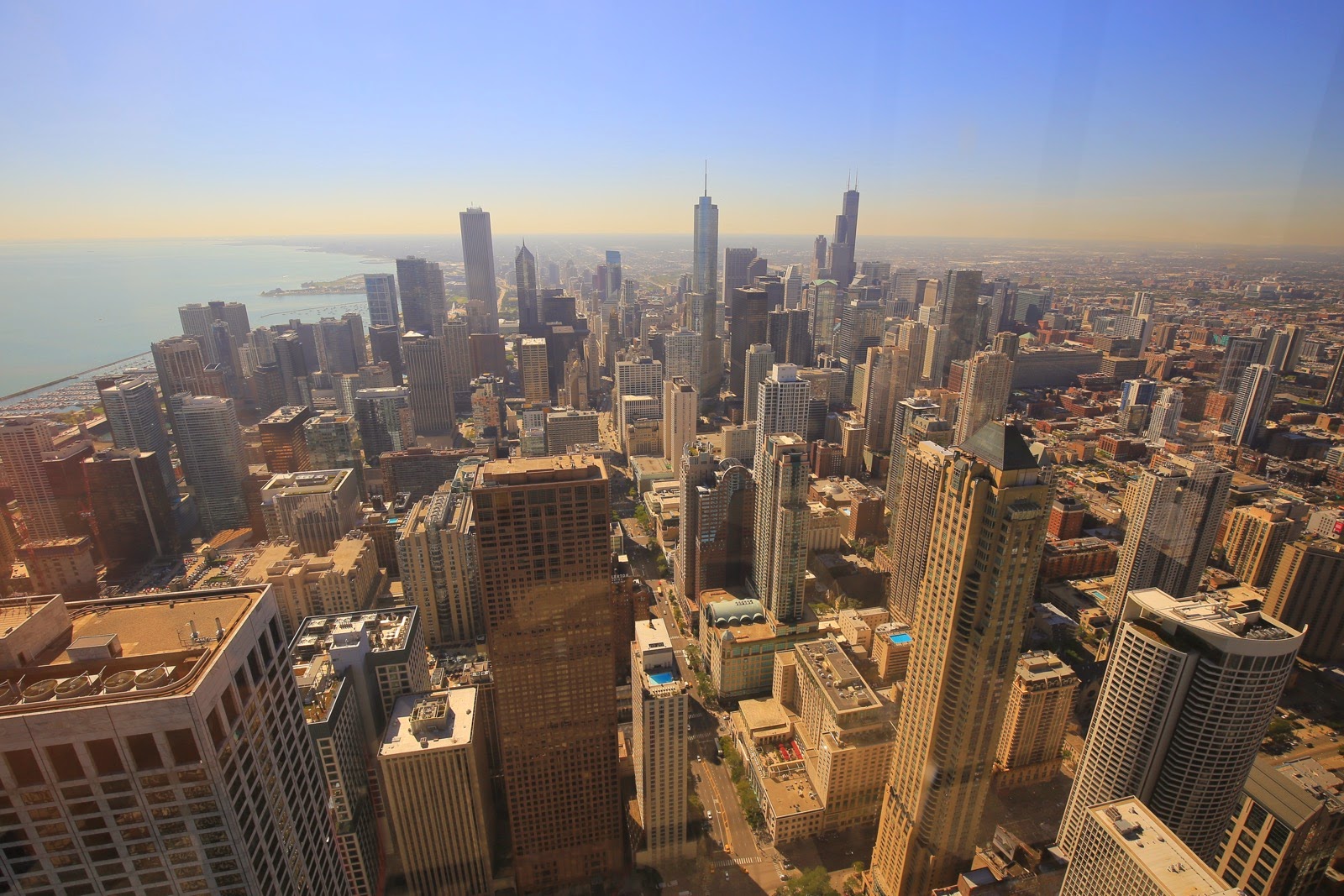 Hypnotisé par la vue, on a dû faire le tour au moins 4 ou 5 fois avant de reprendre l’ascenseur ! Quelle que soit l’orientation, la vue est splendide : à l’ouest Navy Pier et l’énorme Lac Michigan, au nord Lincoln Park avec ses plages, au sud The Loop avec l’alignement Willis Tower, Trump Tower et Aon Center, les 3 plus hautes constructions de Chicago.
