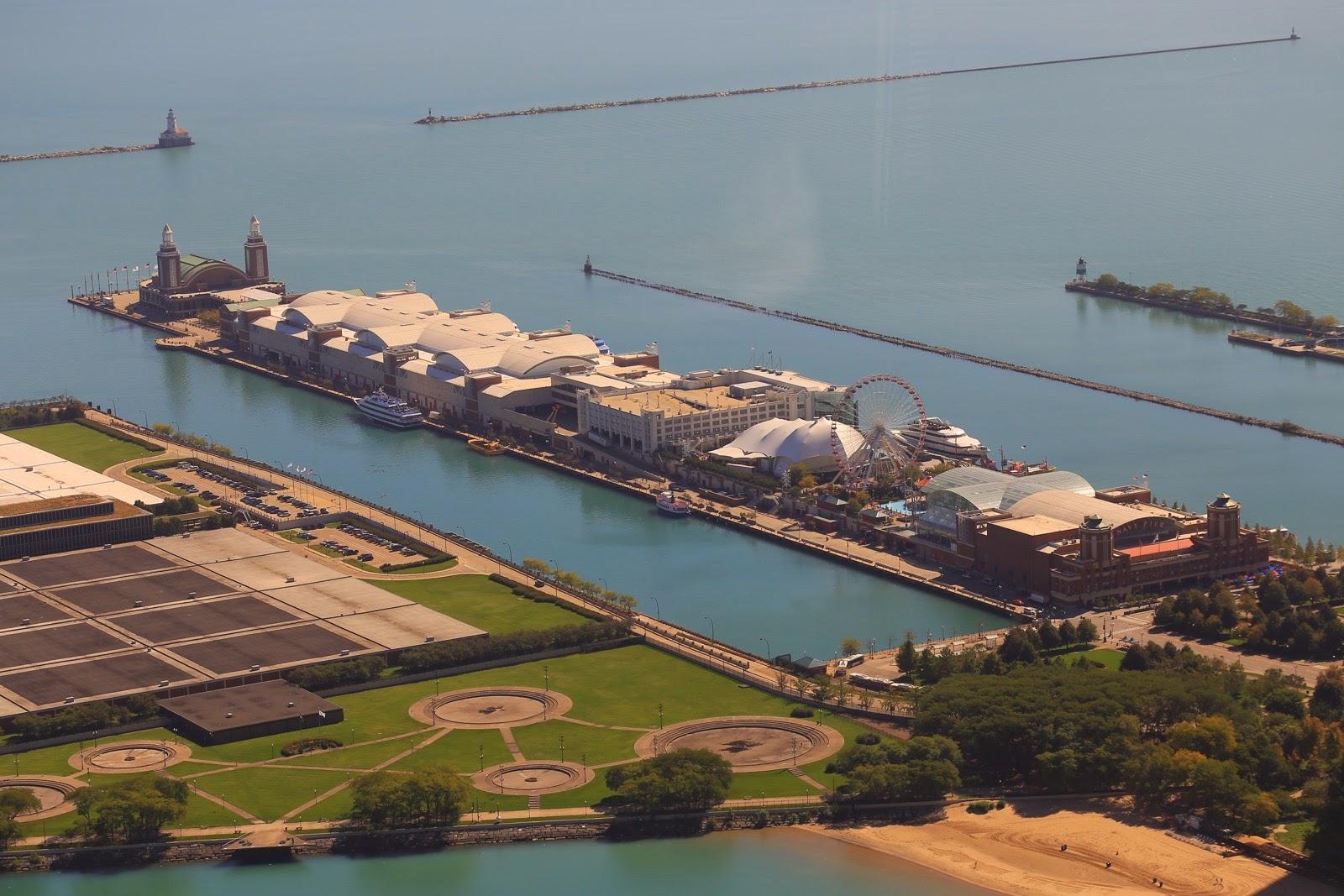 Plus loin, il y a Navy Pier avec sa grande roue qui achève de faire ressembler Chicago à une destination de bord de mer. Ici les restaurants côtoient les cinémas et les embarcadères pour croisière. Au bout de cette jetée de près d’1 km, on dispose d’une vue sympa sur The Loop avec l’Aon Center qui semble la plus haute tour de la ville.