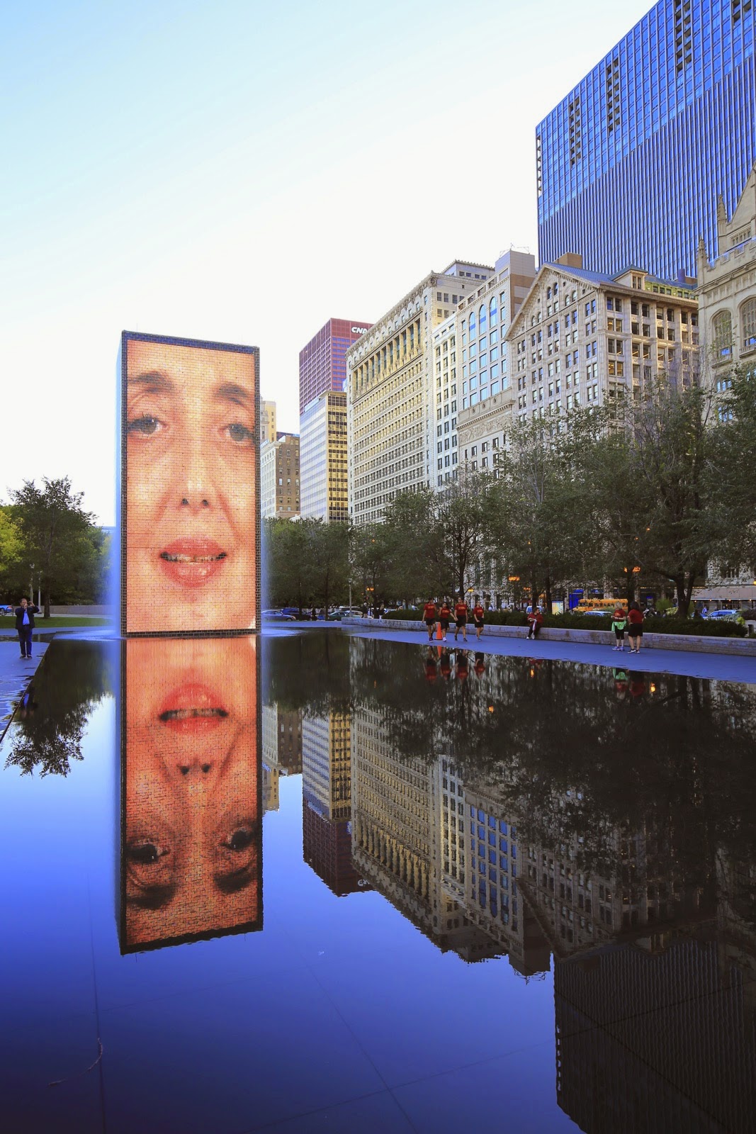 Le soleil commence déjà à se cacher derrière les plus hauts buildings quand on pénètre dans Millenium Park. Sur le site des anciens chantiers ferroviaires de l’Etat, la mairie a conçu à grand frais un parc hallucinant de 10 hectares dédié à l’architecture et à l’art contemporain. On y trouve entre autres, le BP Bridge, la scène aux allures de vaisseau spatial du Pavillon Pritskerainsi que la sculpture baptisée Cloud Gate qui ressemble davantage à un gros haricot totalement chromé (!!!). Ce dernier, offrant des heures d’amusement pour les photographes qui voudraient jouer avec le reflet des bâtiments. Tout comme Crown Fountain mais cette fois, c’est l’eau qui sert de miroir.