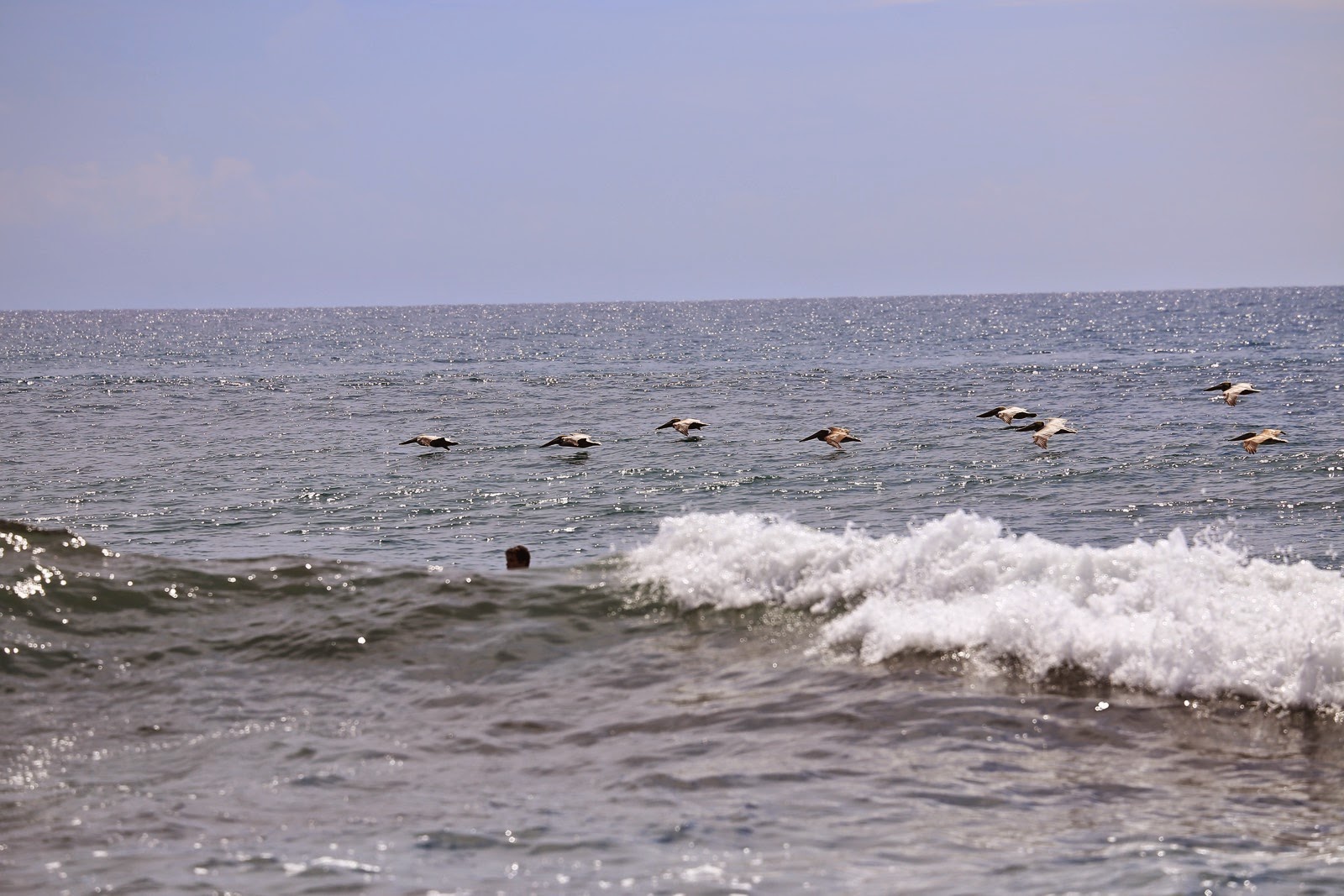 board. Dans les eaux les plus transparentes, on repère de petites raies et leur mouvement majestueux. Dans les vagues qui déferlent, on repère également la silhouette de bancs de poissons. Et je ne me lasserai jamais d’admirer les pélicans qui se laissent planer à quelques centimètres de la crête des vagues. Leur technique de pêche est tout aussi impressionnante ; après un tour de repérage, ils descendent en piquet pour gober le poisson tout entier.
