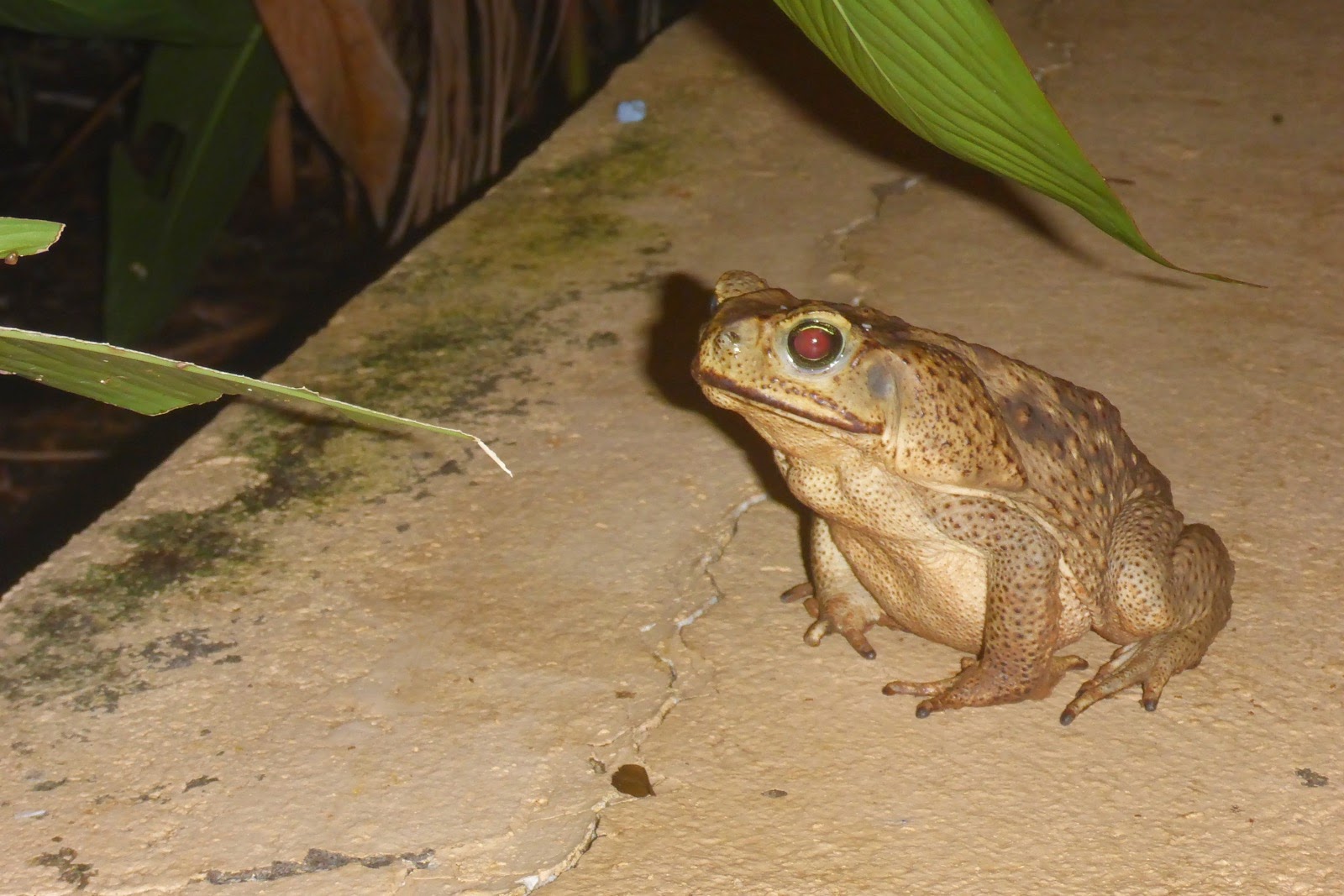 A gauche : crapaud buffle (env 15 cm). A droite : tortue noire de rivière