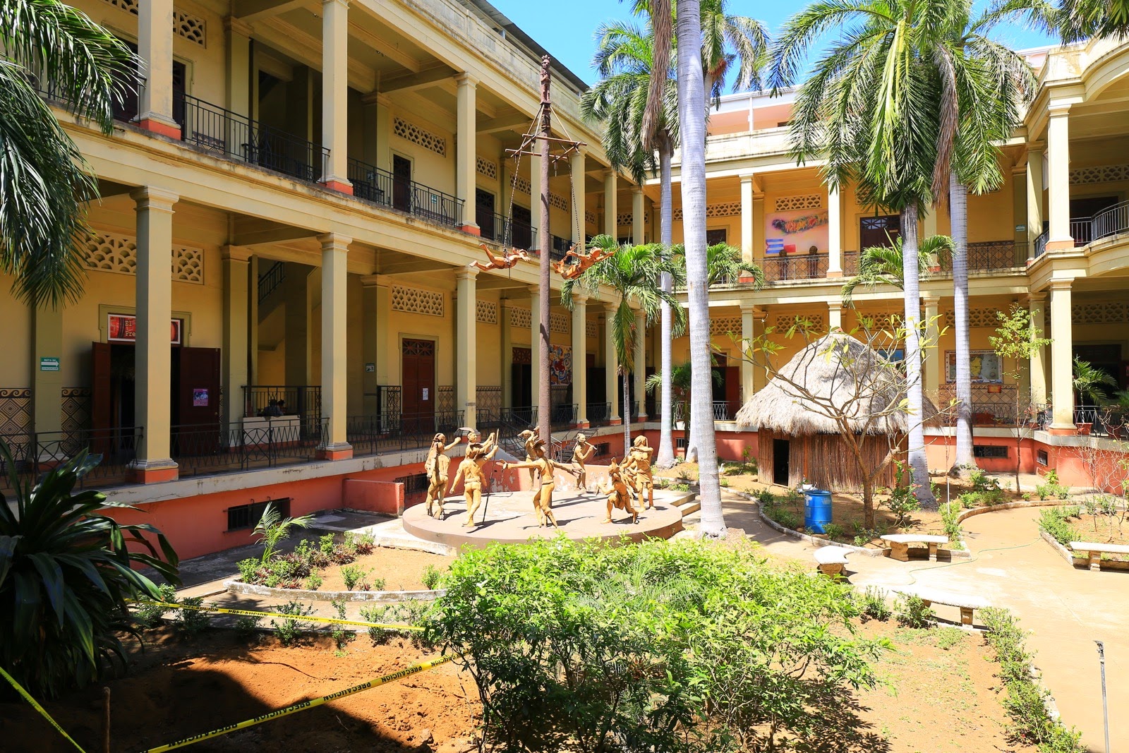 Au nord de la place se trouve la Casa Presidencial et au sud, le Palacio National qui abrite le musée qu’on s’empresse de rejoindre pour nous abriter de la morsure du soleil de ce milieu de journée. On y trouve plusieurs collections aussi bien artistiques que géologiques. On y apprend ainsi la formation de l’isthme, des volcans et on découvre des empreintes de pas datant de 6000/7000 ans excavées au bord du lac dans le quartier de Acahualinca.