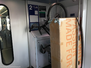 Ainsi, on a dû prendre 3 trains “régionaux“ avec 2 changements à Karlsruhe et Mainz. D’où l’installation de ce bricolage pour trimballer le carton sur les quais et dans les halls de gare. Voyager en train avec son vélo est très commun en Allemagne et tous les 2 wagons, on trouve des emplacements spécifiques pour sa monture.