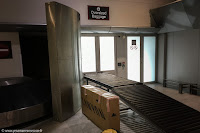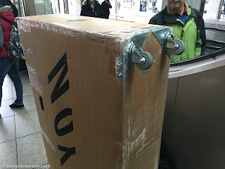 Une fois arrivé au comptoir d’enregistrement, il ne restait qu’à démonter les roulettes et les placer dans le sac à dos pour le voyage retour. Au final, le carton est arrivé sans problème jusqu’à l’aéroport du Cap. Le fond a été un peu altéré et on comprend que le carton a été glissé par les bagagistes. Mais rien de bien de grave et il pourra servir à nouveau pour le retour……… si on trouve où le stocker pendant plus 2 mois !!