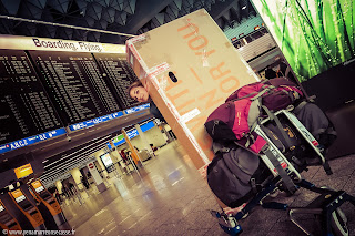 Comme pour nos 2 précédents départs, notre voyage débute à la gare d’Offenburg de l’autre côté du Rhin. Normalement, un train grande vitesse fait le trajet directement jusqu’à l’aéroport de Francfort en 1h30. Sauf qu’ils n’acceptent pas les vélos !!! Idem pour le bus de la navette Lufthansa entre Strasbourg et Francfort.