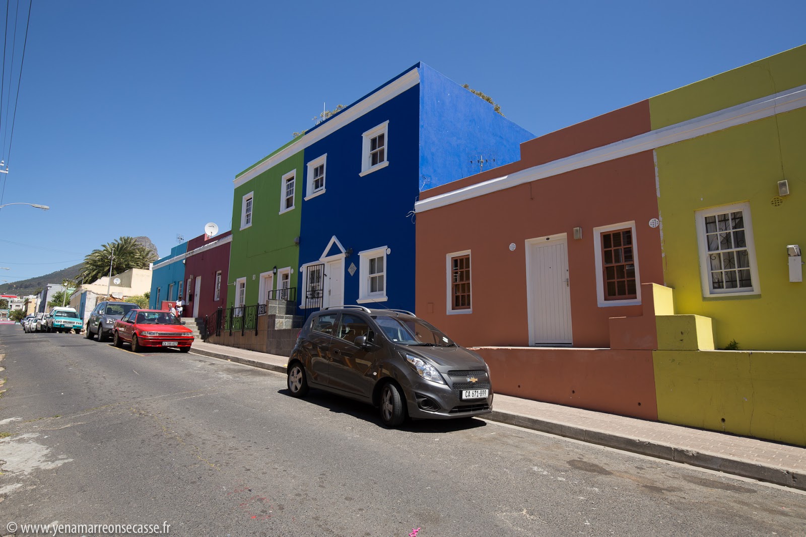En tout cas cette fois, on reste près d’un mois sur place, nous n’aurons plus aucune excuse. On commence par le quartier de Bo-Kaap qui signifie « au-dessus du Cap », en raison de sa position sur les contreforts de la montagne appelée Signal Hill. J’ignore comment on a pu louper cela la première fois ! Cette ancienne garnison de soldats devenue quartier d’esclaves se situe à quelques centaines de mètres du centre. C’est ici que vivait jadis une main d’œuvre originaire d’Inde, d’Indonésie et de Malaisie. Ainsi Bo-Kaap est appelé également le quartier malais ou encore le quartier musulman. Il est très facile de savoir qu’on est à la bonne adresse car la particularité du quartier est que toutes les façades des maisons arborent des couleurs super flash !