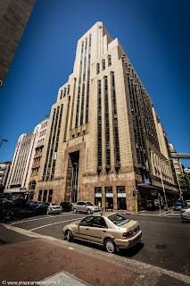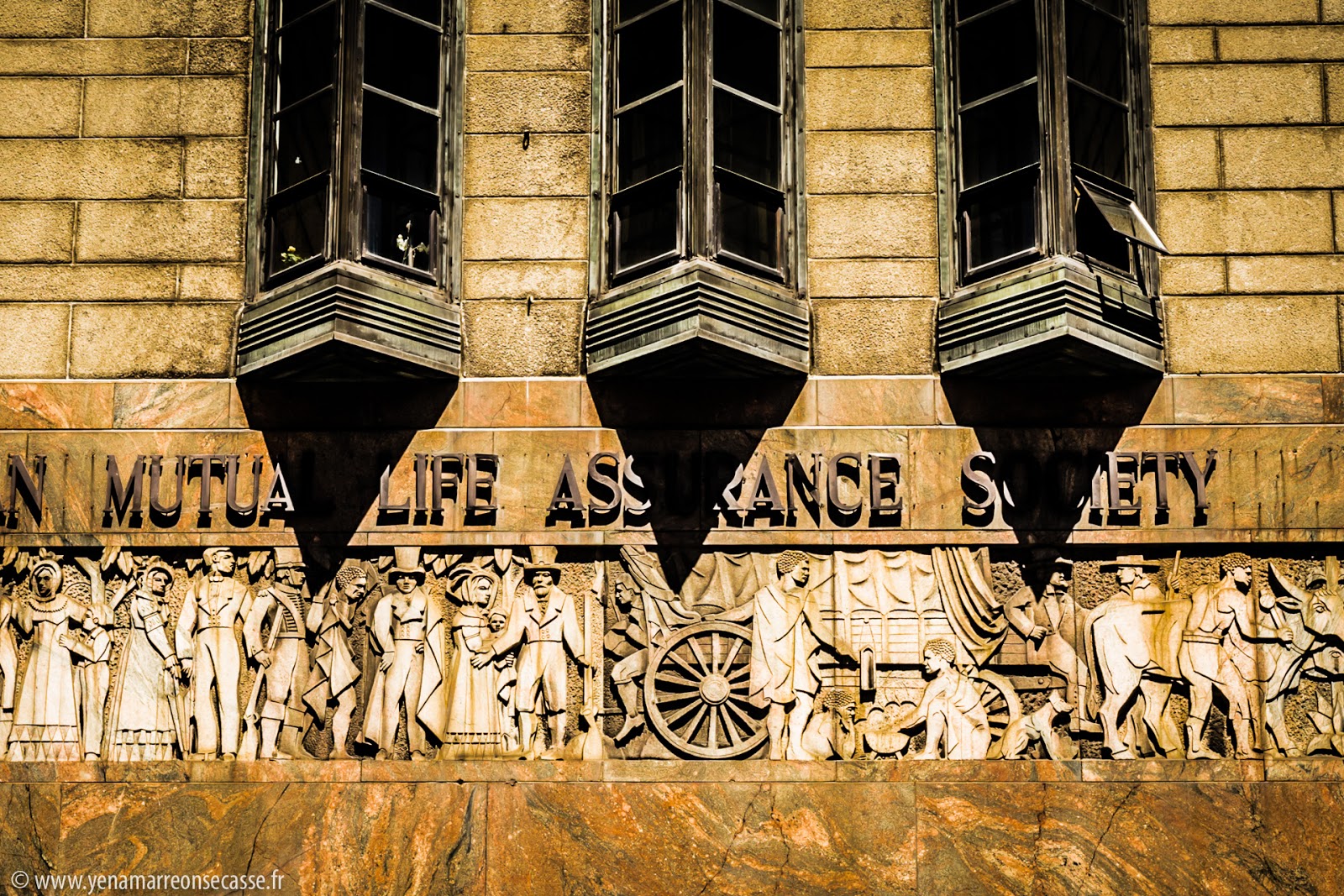 Enfin, on tombe devant l’imposant Mutual Building au style Art Déco qui fut l’ancien siège des assurances Old Mutual durant 20 ans. Lors de son inauguration en 1940, ce fut l’un des plus hauts bâtiments (84 m) du continent africain. La base en marbre est ornée de frises sculptées qui racontent l’histoire du colonialisme du pays, de l’arrivée des Hollandais à la découverte des mines de diamants, en passant par la construction du Fort de Bonne Espérance (prochain article). La partie haute en grès et les immenses fenêtres sont décorées par des figures tribales ainsi que des animaux.