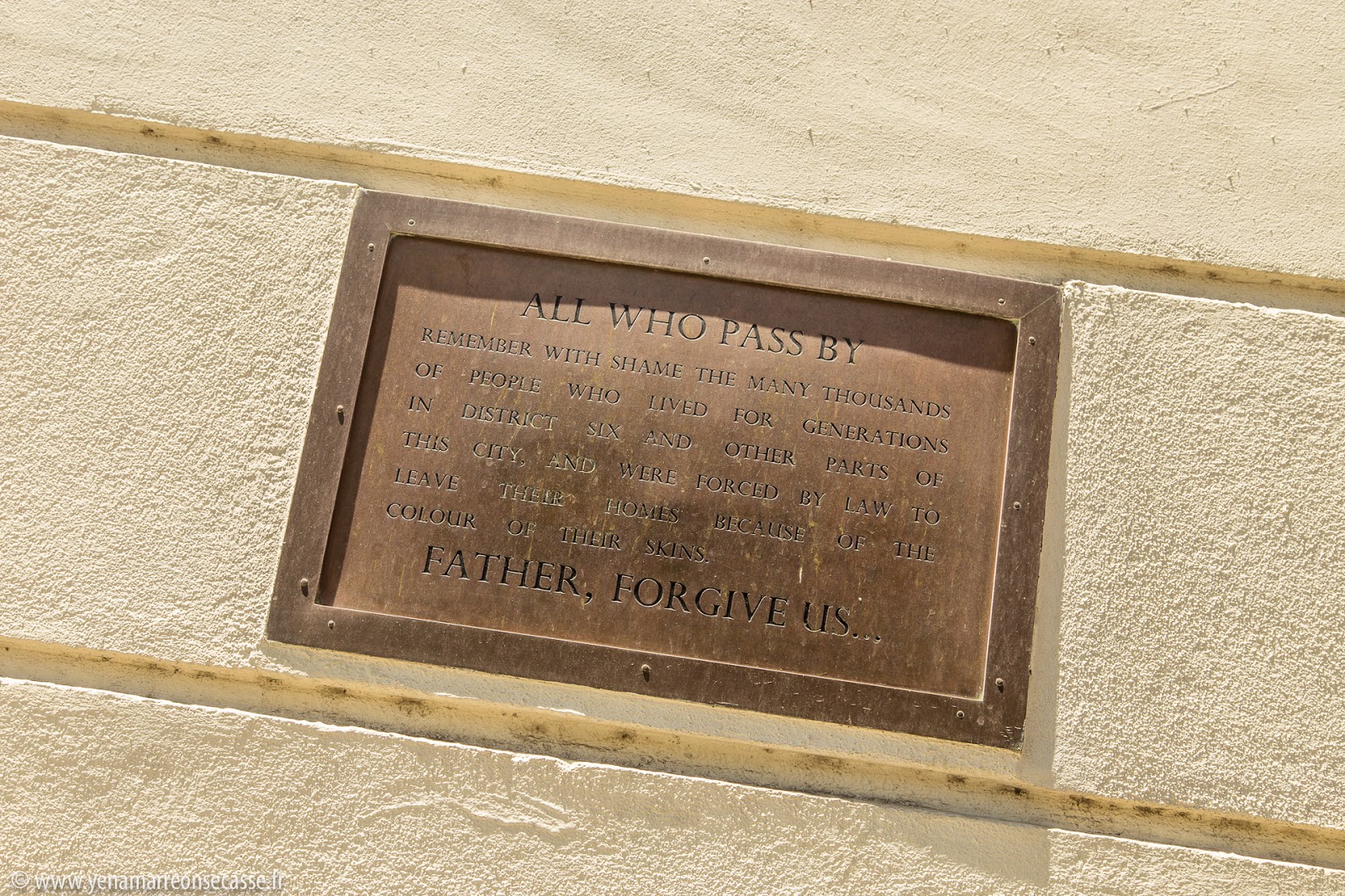 Juste derrière le fort débute le District Six. Dans les années 1960-1970, en plein apartheid, les autorités ont expulsé de force plus de 60.000 personnes qui vivaient dans le quartier, essentiellement des Noirs, des Malais, des Indiens et quelques Afrikaans blancs. Les raisons officielles furent la volonté d’éradiquer les problèmes de drogue, d’alcool, de jeux et de prostitution mais l’opération était évidemment d’éloigner les “hommes de couleur“ du centre de Cape Town.