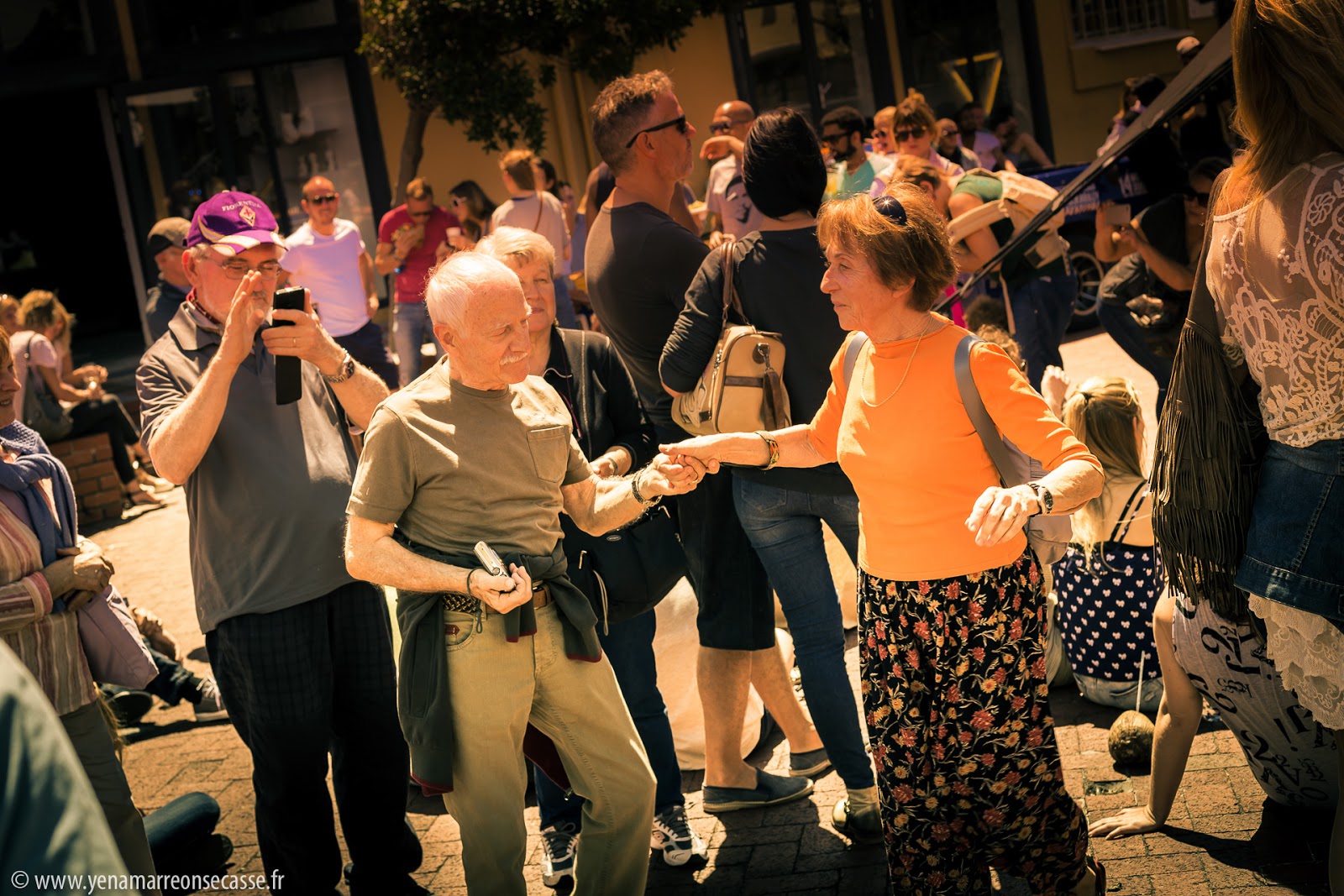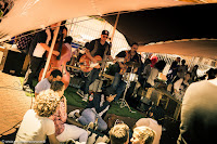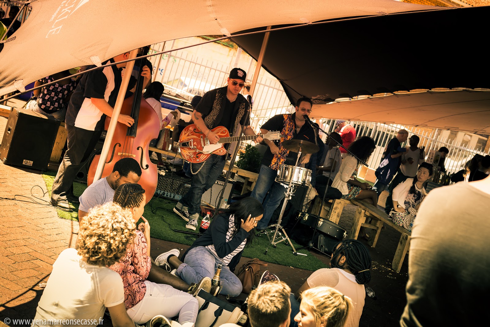 Tout est préparé à la minute devant vous et chacun savoure son assiette à de longues tables disposées au centre. L’ambiance est conviviale, on y parle toutes les langues et il ne faut pas longtemps pour sympathiser avec son voisin. A l’extérieur, ceux qui préfèrent rester au soleil ou qui n’ont pas trouvé de place, sont assis par terre devant la tente qui abrite un groupe de rock qui fera bouger nos corps pour accélérer la digestion !!
