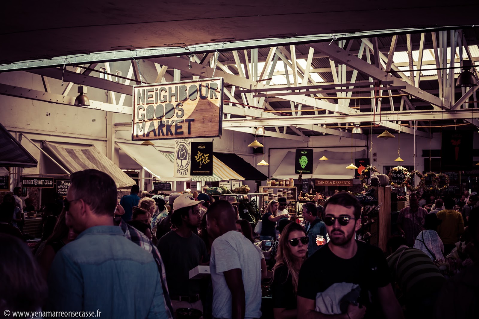 Dans le même complexe, chaque samedi se déroule le Neighbourgoods Market qu’on vous conseille vivement. Le matin, baladez-vous dans les boutiques de déco, de fringues et de souvenirs. A l’heure de l’apéro, dégustez un verre de vin local à la boutique dans la cour du block D. Et pour le lunch, éclatez vous la panse au food market. Des dizaines de stands proposent aussi bien une cuisine locale que des préparations des 4 coins du globe. Il y a même de la flammenkueche ! Le choix est super difficile mais n’attendez pas trop longtemps car les plats les plus prisés arrivent rapidement en rupture de stock ! C’est ainsi qu’on a loupé le steak d’Argentine ainsi que les huîtres locales qu’on déguste ici avec du Tabasco.